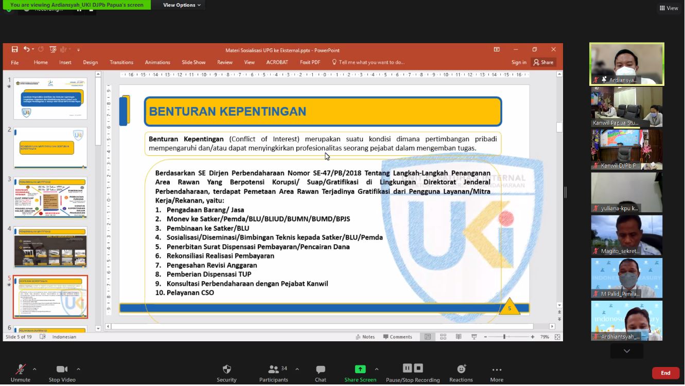 Kegiatan Rakorda Pelaksanaan Anggaran Semester I Tahun 2021 dilaksanakan pada tanggal 29 Juli 2021 dengan mengundang seluruh satker di lingkup wilayah Ditjen Perbendaharaan Provinsi Papua. Rakorda Pelaksanaan Anggaran tersebut dilaksanakan dengan mekanisme hybrid yaitu mengundang online seluruh satker yang ada di Provinsi Papua melalui aplikasi zoom meeting (dimana sebagian satker yang tidak dapat bergabung pada aplikasi zoom meeting secara langsung dapat menyimak melalui Youtube Kanwil DJPb Provinsi Papua) dan mengundang perwakilan satker Ditpamobvit Polda Papua yang mendapatkan penghargaan nilai Indikator Kinerja Pelaksanaan Anggaran (IKPA) terbaik kategori Pagu Besar (> 50 Miliar Rp) untuk menghadiri rapat tersebut secara offline di RR Kanwil DJPb Papua. Dipimpin langsung oleh Kepala Kanwil DJPb Provinsi Papua, Burhani AS, pelaksanaan kegiatan dengan menetapkan prokes secara ketat.