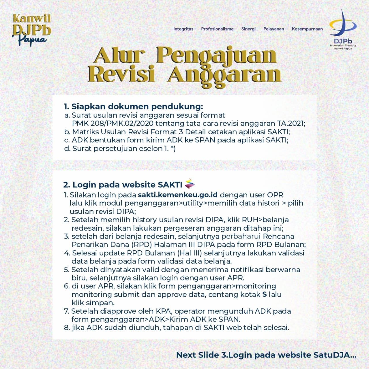 - Satuan Kerja dapat memahami terkait aturan revisi anggaran tahun 2021 dengan lebih baik terutama dokumen persyaratan yang diperlukan untuk mengajukan revisi sesuai kewenangan berdasarkan PMK 208/PMK.02/2020.