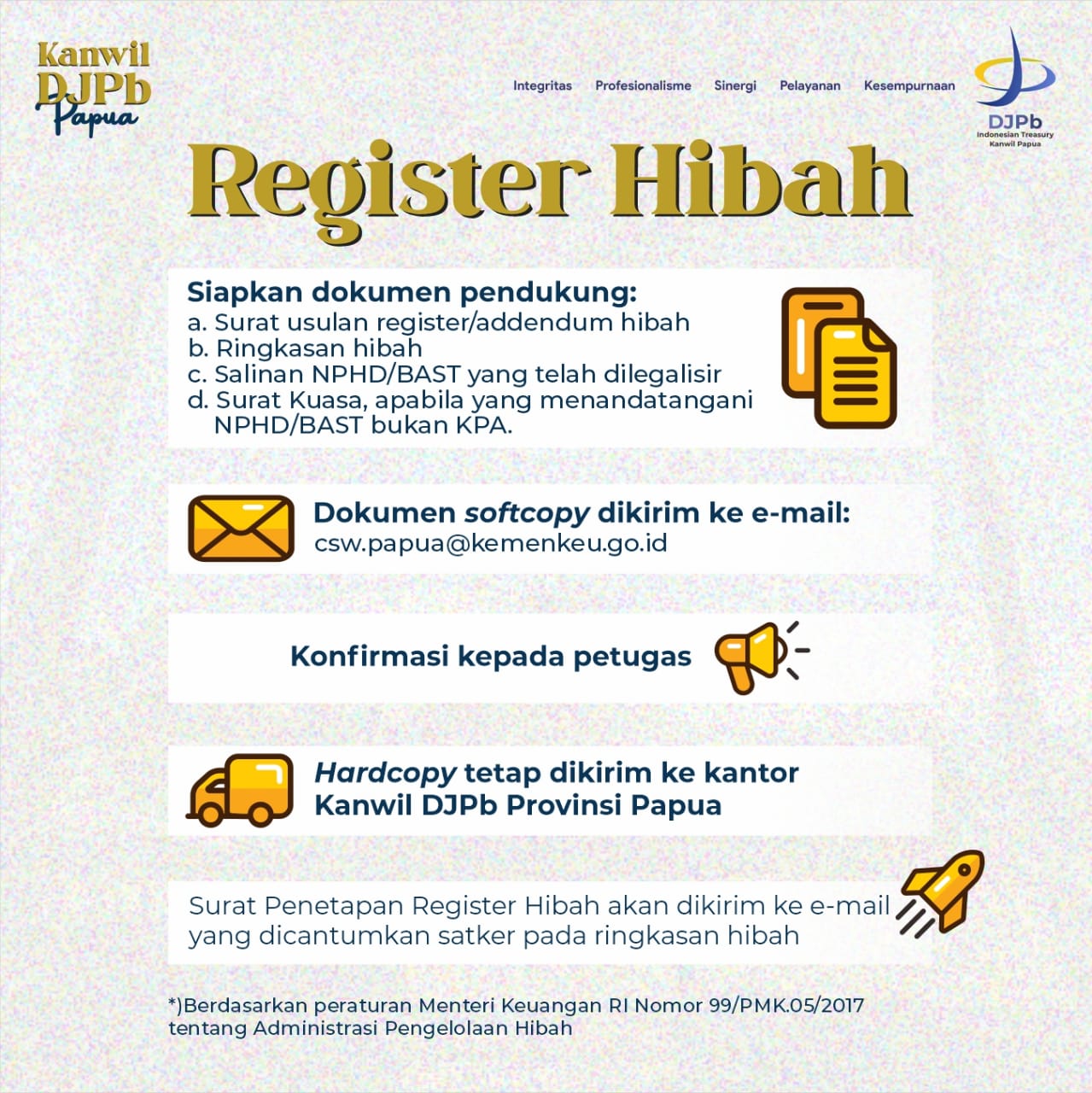- Satuan kerja dapat memahami langkah-langkah serta tata cara yang harus dilakukan dalam mengadministrasikan hibah langsung yang diterima dengan mengingat kata kunci yaitu 3R1P (penetapan Register, pembukaan Rekening, Revisi DIPA dan terakhir Pengesahan hibah tersebut).