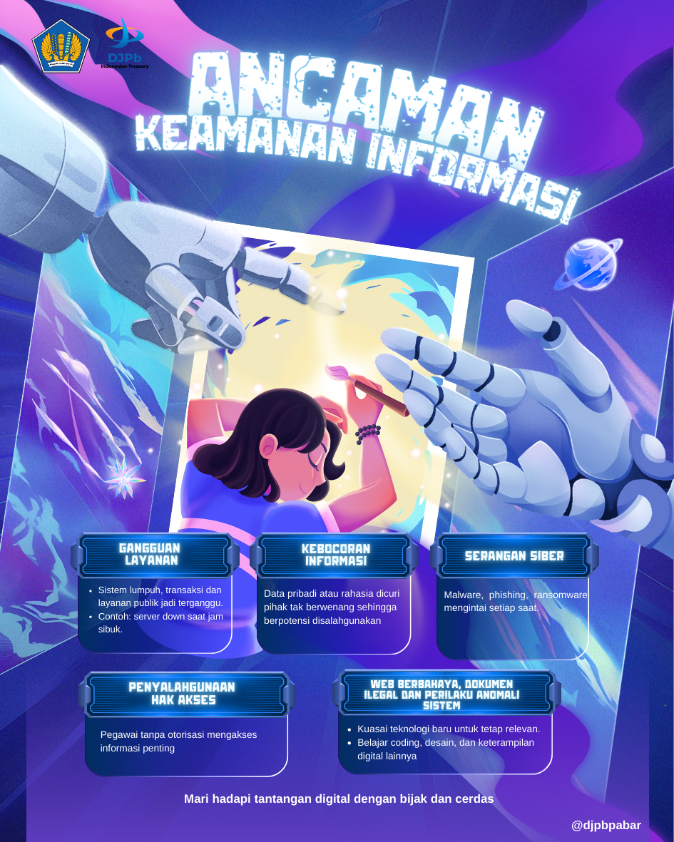 Tak kalah penting, ancaman juga bisa datang melalui web berbahaya dan dokumen ilegal, seperti penggunaan software bajakan yang diam-diam membawa malware. Reputasi organisasi pun bisa tercoreng hanya karena kelalaian kecil tersebut. Selain itu, tanda-tanda awal serangan sering terlihat dari perilaku anomali sistem, misalnya komputer tiba-tiba melambat, muncul aktivitas tidak wajar, atau sistem bekerja dengan cara yang aneh. Gejala sekecil apapun jangan pernah dianggap remeh, melainkan segera dilaporkan kepada Petugas Keamanan Informasi. Pada akhirnya, keamanan informasi bukan hanya tugas satu orang atau satu unit, melainkan tanggung jawab bersama. Dengan waspada dan saling peduli, kita dapat menciptakan lingkungan digital yang lebih aman dan terpercaya.