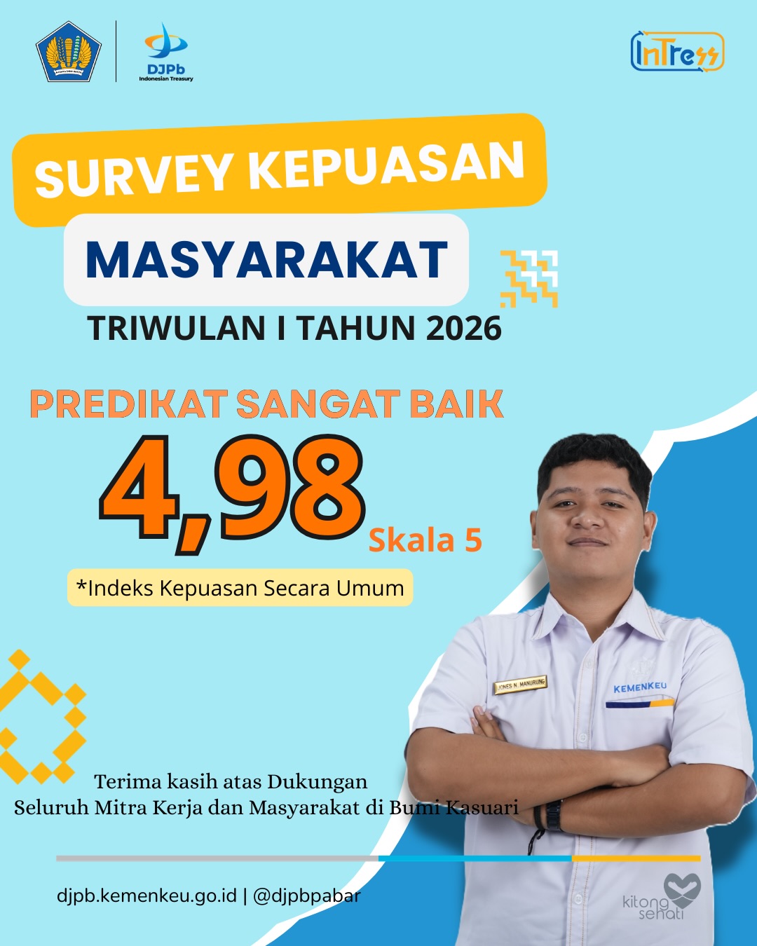 Berdasarkan hasil Indeks Survei Kepuasan Masyarakat, Kanwil Direktorat Jenderal Perbendaharaan Provinsi Papua Barat meraih predikat “Sangat Baik” dengan nilai 4,98 dari skala 5. Hasil Indeks ini menunjukkan capaian yang tinggi pada Kanwil DJPb Papua Barat pada awal Tahun Anggaran 2026. Capaian ini menjadi sebuah kehormatan bagi kami dan motivasi untuk senantiasa memberikan pelayanan terbaik kepada masyarakat, pemerintah daerah, dan seluruh mitra kerja.