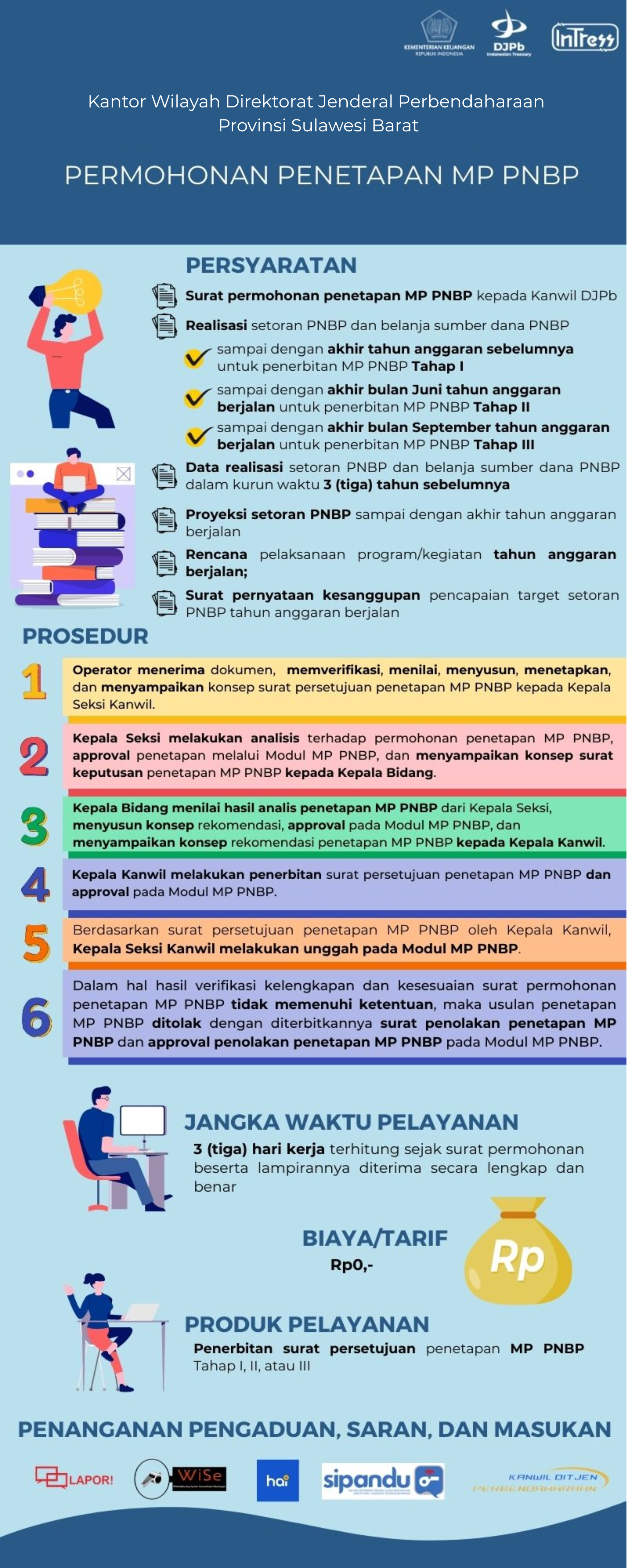 - Operator menerima dokumen, memverifikasi, menilai, menyusun, menetapkan, dan menyampaikan konsep surat persetujuan penetapan MP PNBP kepada Kepala Seksi Kanwil.