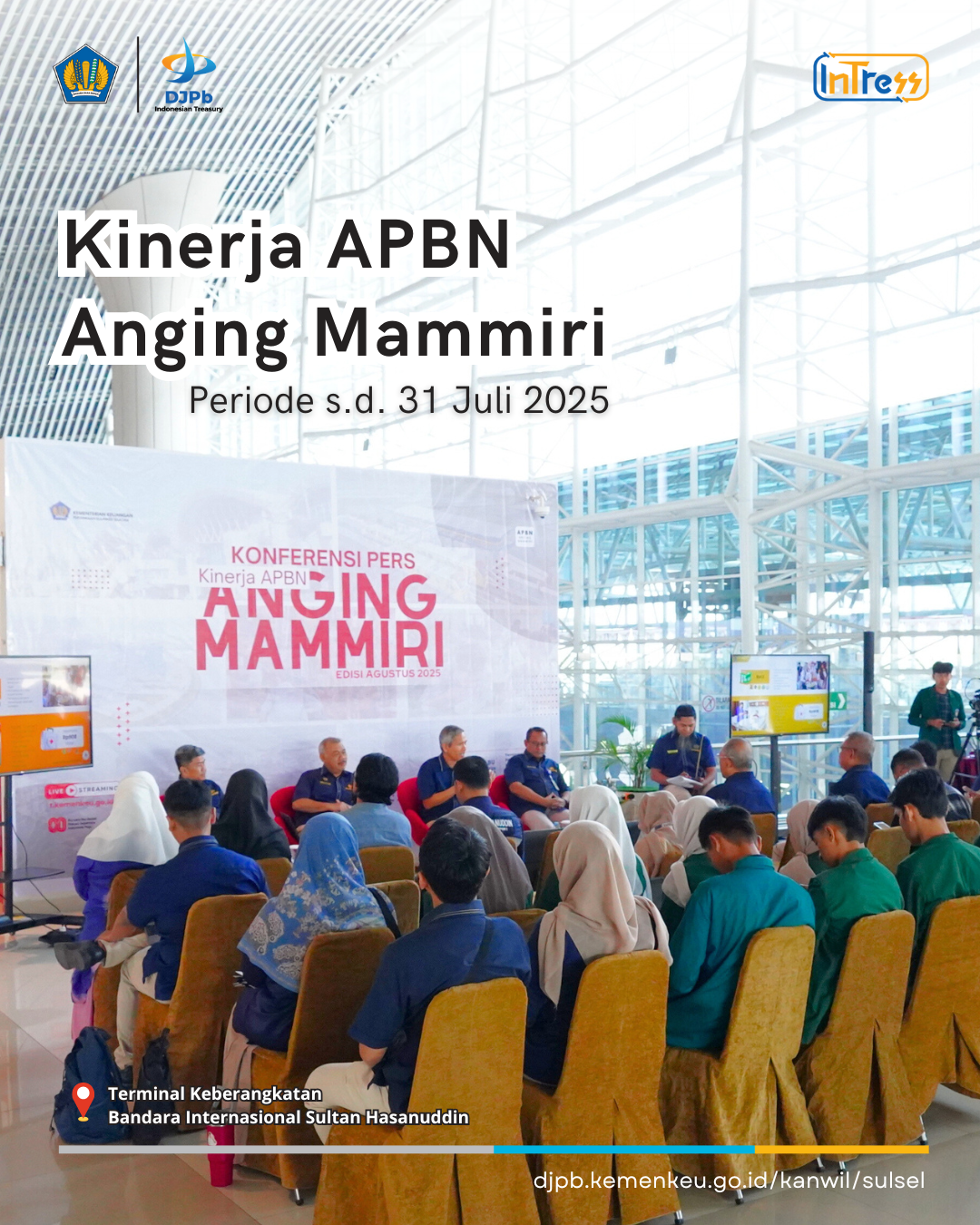 Kantor Perwakilan Kementerian Keuangan Provinsi Sulawesi Selatan menggelar konferensi pers untuk merilis kinerja APBN regional Sulawesi Selatan periode s.d. 31 Juli 2025 yang diselenggarakan pada hari Rabu, 27 Agustus 2025 di Terminal Keberangkatan Bandar Udara Sultan Hasanuddin Makassar dan dapat disaksikan melalui Live Youtube melalui tautan t.kemenkeu.go.id/APBNSulsel2025.