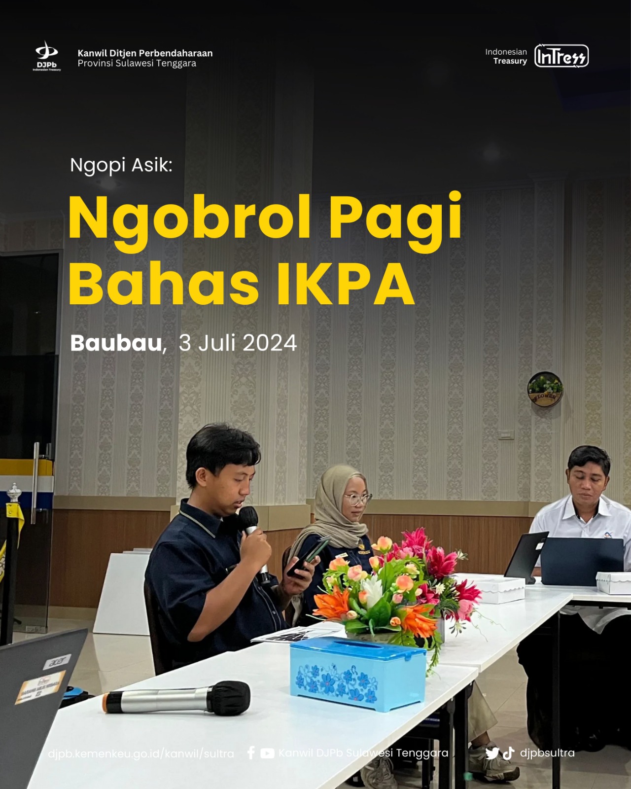 Kanwil DJPb Provinsi Sulawesi Tenggara telah menyelenggarakan kegiatan NGOPI ASIK (Ngobrol Pagi Bahas IKPA) yang berlokasi di Aula KPPN Bau-Bau. Kegiatan dilaksanakan pada hari Rabu, 3 Juli 2024 dengan mengundang 6 Satker terpilih. NGOPI ASIK membahas mengenai evaluasi nilai IKPA Satker, kinerja pelaksanaan anggaran, serta kendala pelaksanaan anggaran sampai dengan Semester I tahun 2024.