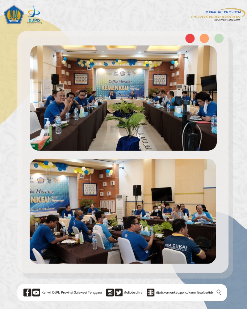 Jumat (4/2), bertempat di Aula Kanwil DJPb Prov. Sulawesi Tenggara telah dilaksanakan Coffee Morning Kemenkeu Satu yang dihadiri oleh jajaran Kantor Perwakilan Kementerian Keuangan di Sulawesi Tenggara, diantaranya Plt. Kepala Kanwil DJPb Prov. Sultra (juga sebagai Kepala Perwakilan Kemenkeu Sultra) beserta jajaran; Kepala KPPN Kendari, Kepala KPPN Raha, Kepala KPPN Kolaka, Kepala KPP Kolaka, Kepala KPP Kendari, dan Perwakilan dari KPKNL Kendari dan KPP BC Kendari. Adapun sebelum Coffee Morning dimulai, telah dilaksanakan Senam Bersama terlebih dahulu di halaman Kanwil DJPb Provinsi Sulawesi Tenggara.