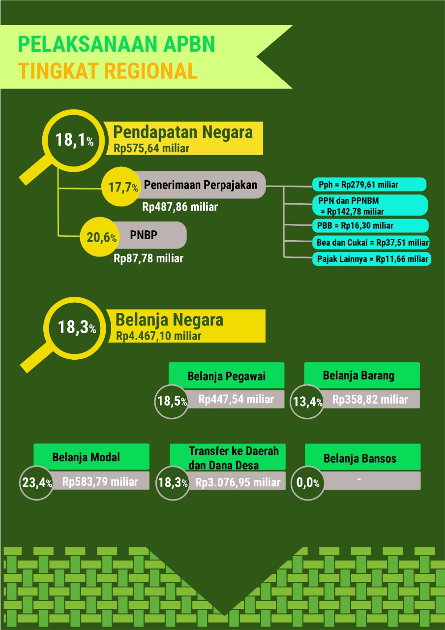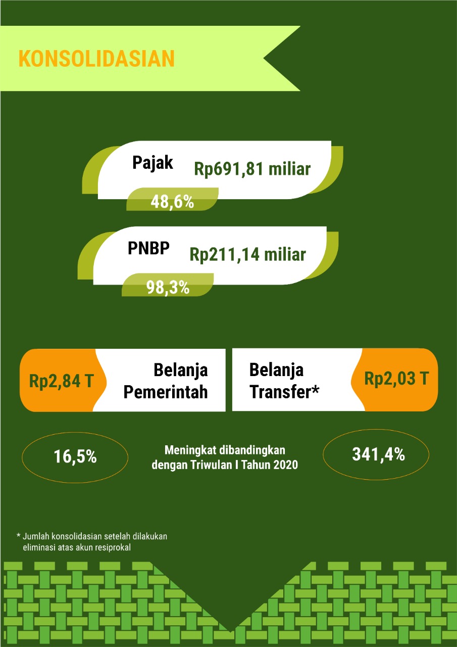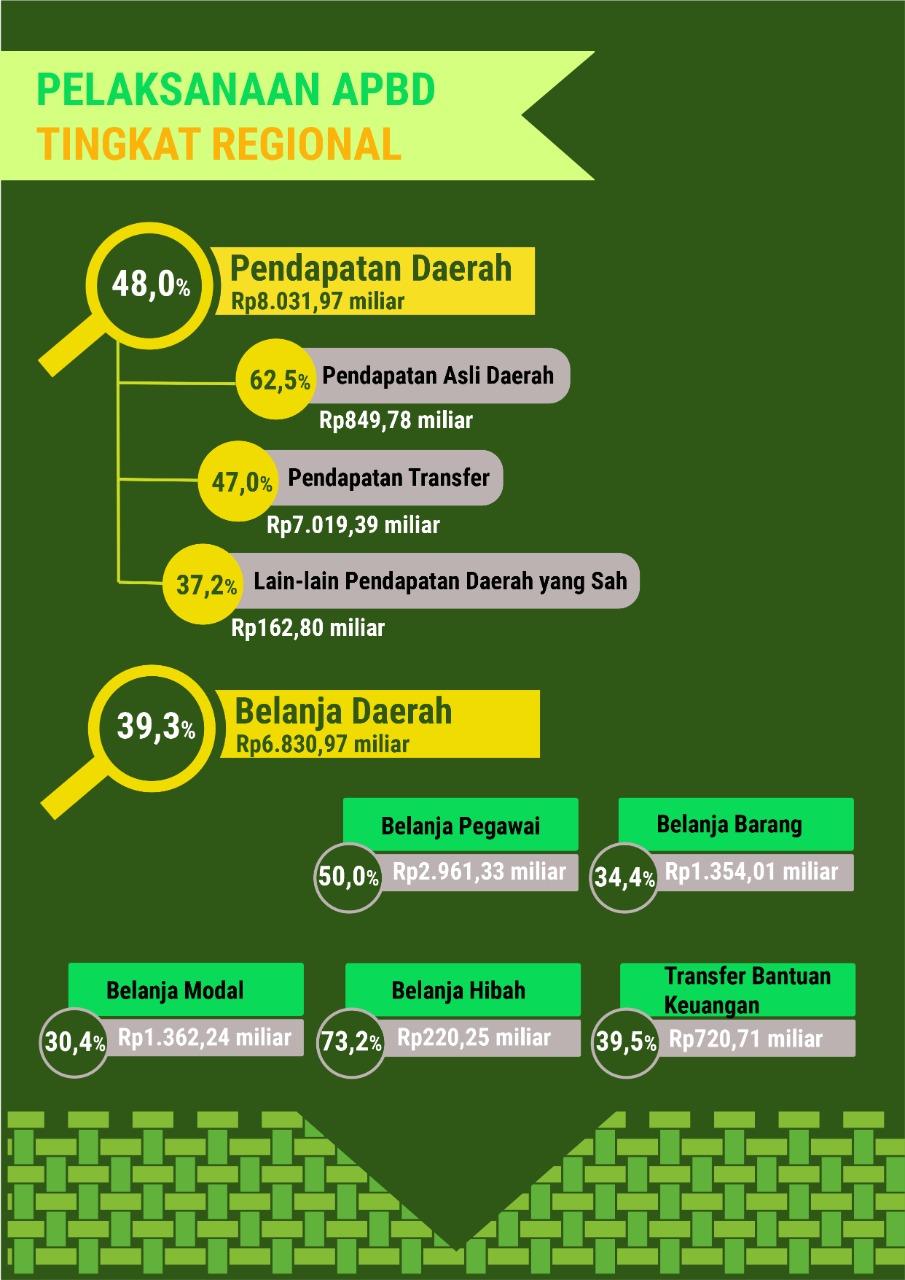 Pendapatan pemda telah mencapai 48,01% dari target sementara realisasi belanja telah mencapai 39,29% dari pagu belanja. Realisasi pajak daerah meningkat 480% setara dengan Rp357,72 miliar.