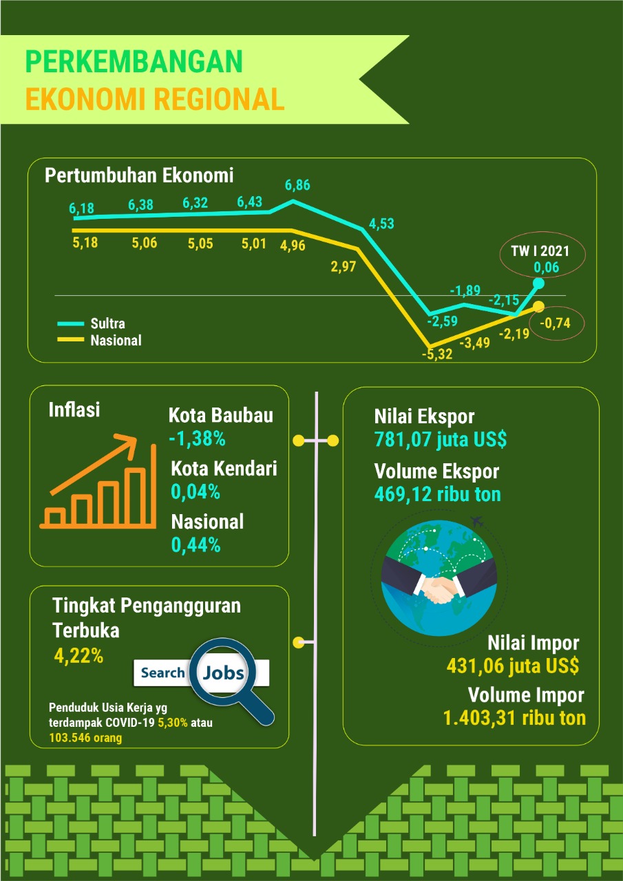 Perekonomian Sultra di triwulan I 2021 telah memasuki zona positif dengan capaian 0,06%. Ekspor Sultra menjadi penentu bagi tumbuhnya perekonomian Sultra dengan pertumbuhan mencapai 75,33%. Tingkat Pengangguran (TPT) Terbuka di Sultra turun 5,85% atau sebesar 4,22% dari total Angkatan kerja per Februari 2021. Nilai Tukar Petani (NTP) turun dari 97,28 di Desember 2020 menjadi 96,89 di akhir triwulan I 2021. Kesejahteraan petani masih perlu ditingkatkan terutama untuk petani pada subsektor perkebunan rakyat.