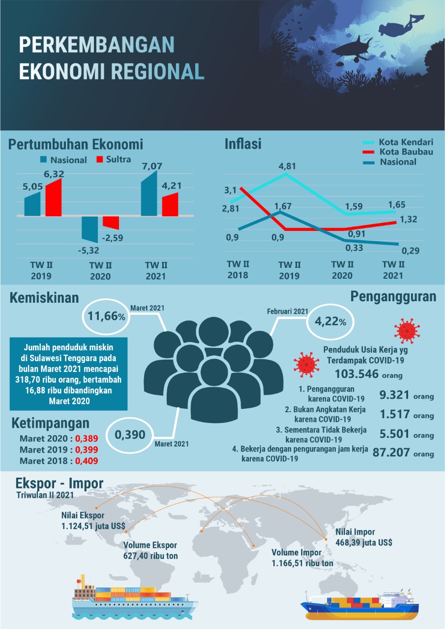 Kinerja perekonomian Sultra pada triwulan II 2021 tumbuh 4,21%. Seluruh lapangan usaha tumbuh positif, bahkan beberapa lapangan usaha yang sempat mengalami kontraksi paling dalam dapat tumbuh cukup signifikan. Sektor penyumbang terbesar pertumbuhan Sultra adalah perdagangan besar dan eceran dengan kontribusi terhadap pertumbuhan Sultra sebesar 0,84%. Sedangkan pada sisi pengeluaran konsumsi rumah tangga (PK-RT) tidak lagi menjadi komponen yang mendominasi PDRB Sultra dan tergantikan oleh kegiatan ekspor.