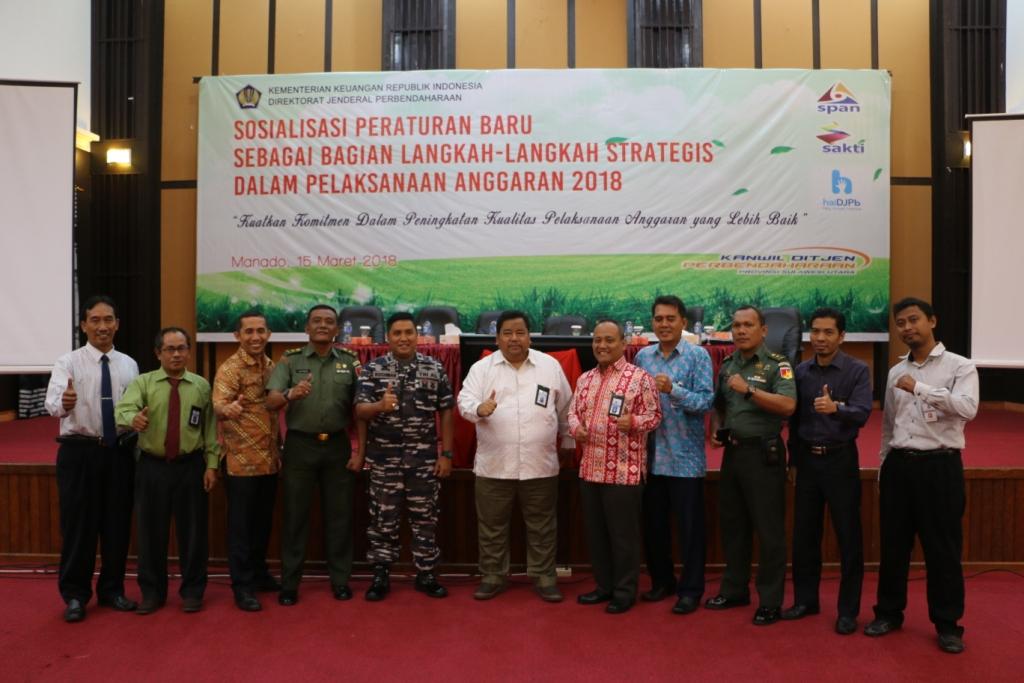 Kepala Kantor Wilayah Ditjen Perbendaharaan, Bapak Sulaimansyah, pada hari Kamis, 15 Maret, Pukul 09.00 WITA s.d 13.30 WITA, di Lantai 6 Gedung Keuangan Negara Jl. Bethesda No. 8 Manado, membuka dan memimpin acara sosialisasi peraturan-peraturan bidang Pelaksanaan anggaran