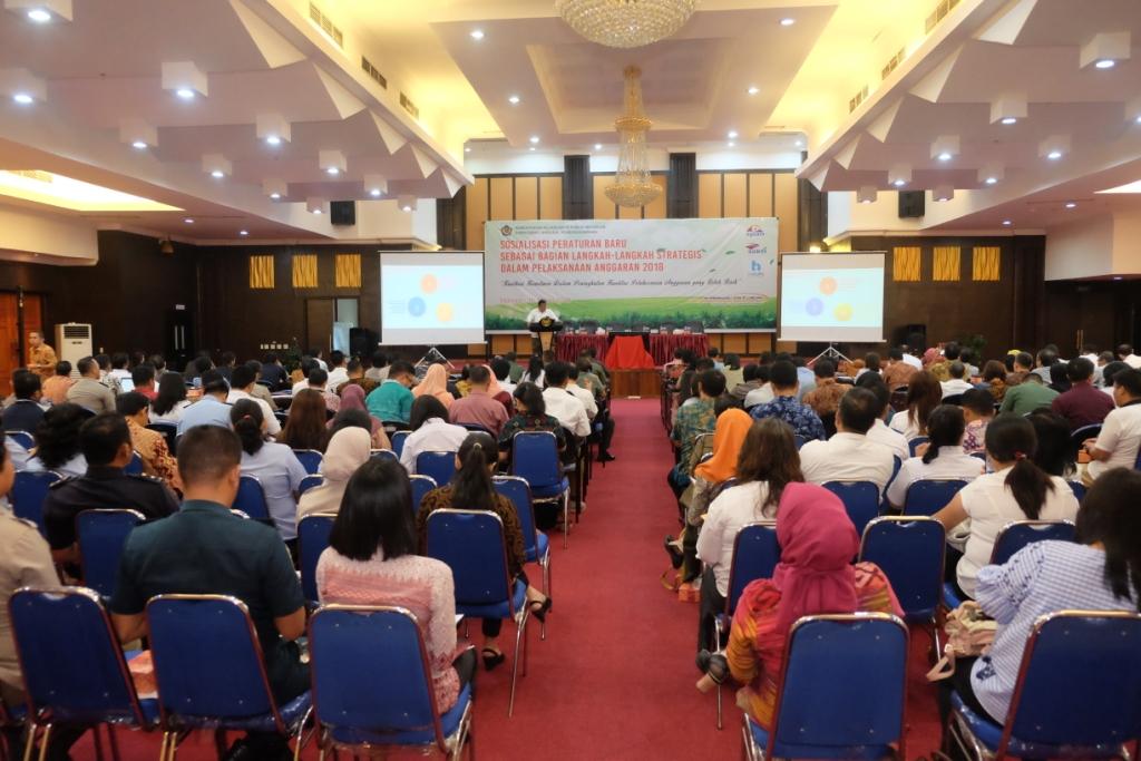 Penghargaan kepada satker Dalam acara sosialisasi ini, kepala Kanwil Ditjen Perbendaharaan Provinsi Sulawesi Utara menyampaikan bahwa kegiatan sosialisasi ini adalah merupakan bagian dari langkah langkah strategis dalam pelaksanaan anggaran tahun 2018 sekalius untuk menyamakan persepsi terhadap peraturan peraturan baru agar ketika menerapkan di lapangan tempat kerja masing-masing satker tidak meninmbulkan permasalahan yang barakibat pada terhambatnya pelaksanaan kegiatan-kegiatan yang ada.
