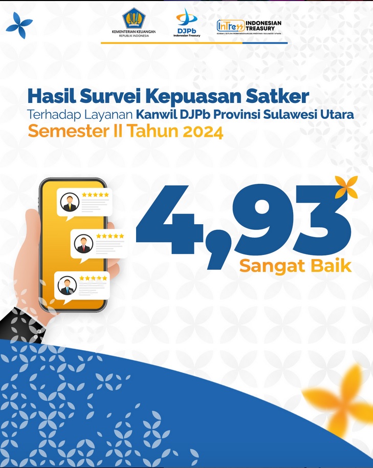 Hasil survei ini menjadikan stimulus semangat bagi kami, Insan Perbendaharaan di Sulawesi Utara, untuk terus memberikan pelayanan terbaik. Saran perbaikan yang bapak/ibu sampaikan, akan menjadi perhatian untuk segera kami tindaklanjuti.🙏🏻😇
