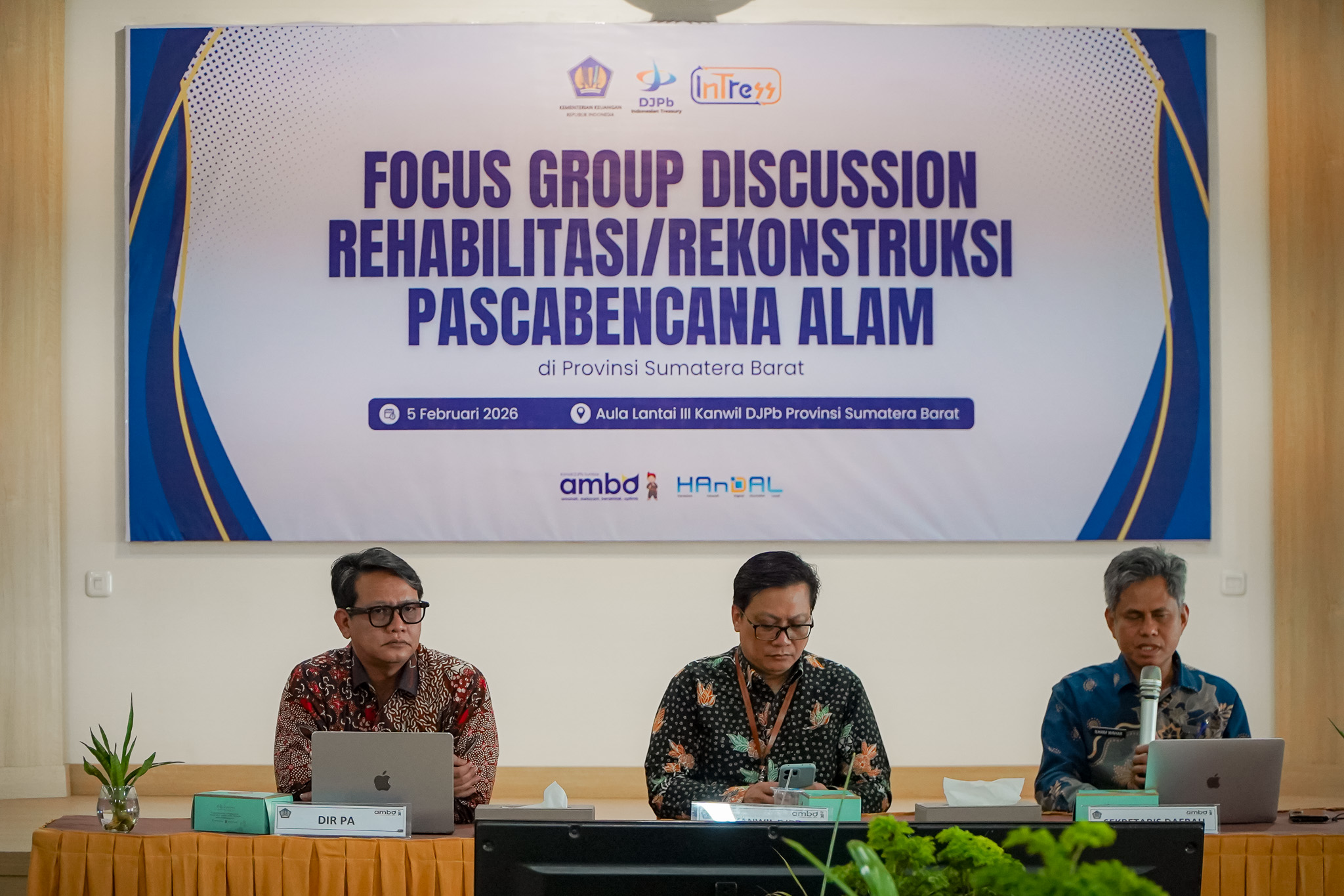 Padang, 5 Februari 2026 - Kantor Wilayah Direktorat Jenderal Perbendaharaan (Kanwil DJPb) Provinsi Sumatera Barat menyelenggarakan Focus Group Discussion (FGD) Rehabilitasi dan Rekonstruksi Pascabencana Alam pada Kamis (5/2) bertempat di Aula Kanwil DJPb Provinsi Sumatera Barat. Kegiatan ini dilaksanakan sebagai upaya memperkuat koordinasi dan menyamakan persepsi lintas pemangku kepentingan dalam mendukung percepatan pemulihan wilayah terdampak bencana di Sumatera Barat.