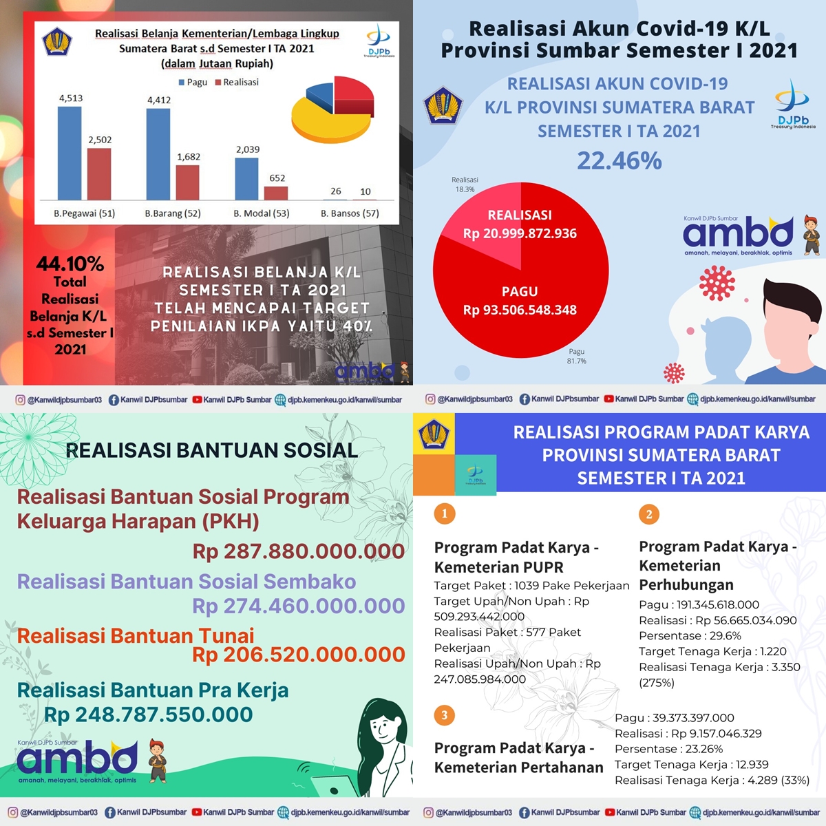Realisasi pendapatan negara di Sumbar sampai dengan triwulan II 2021 sebesar Rp3,34 triliun, tumbuh 23,95 persen (y-o-y). Pertumbuhan ini didorong oleh penerimaan perpajakan yang tumbuh 43,71 persen (y-o-y). Di sisi lain, belanja pemerintah pusat di Sumbar mengalami pertumbuhan 10,01 persen yang didorong oleh pertumbuhan dari keempat jenis belanja yaitu belanja pegawai, barang, modal dan bantuan sosial. Sementara belanja Transfer Ke Daerah dan Dana Desa (TKDD) mengalami kontraksi 4,37 persen yang disebabkan karena adanya penurunan jumlah realisasi DAK Fisik dan Dana Desa.