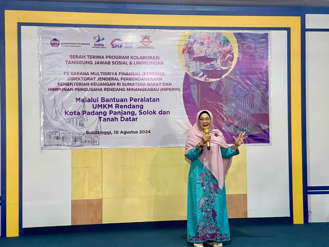 Syukriah HG, dalam sambutannya di Aula KPPN Bukittinggi menyampaikan bahwa bantuan ini adalah berasal dari Kemenkeu Satu. Kemenkeu tidak hanya Ditjen Pajak, Perbendaharaan, Bea Cukai namun juga unit-unit SMV seperti halnya PT SMF yang hadir saat ini. Kemenkeu memiliki komitmen tidak hanya sebagai pengelola fiskal namun akan terus hadir mendorong peningkatan UMKM di daerah. Bantuan ini diharapkan sebagai pendorong semangat kepada UMKM untuk terus maju. Pemerintah akan memberikan support untuk kemajuan UMKM.