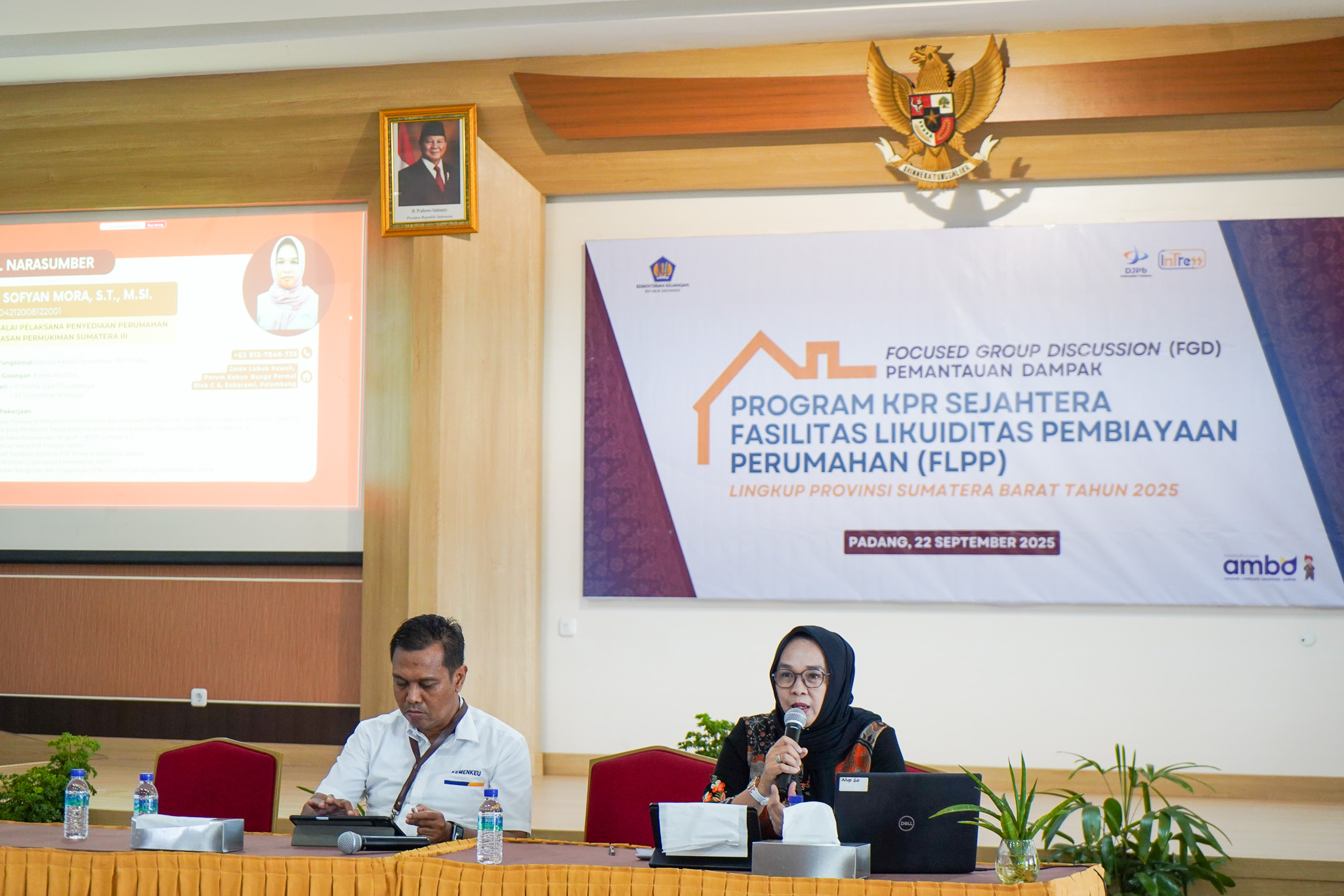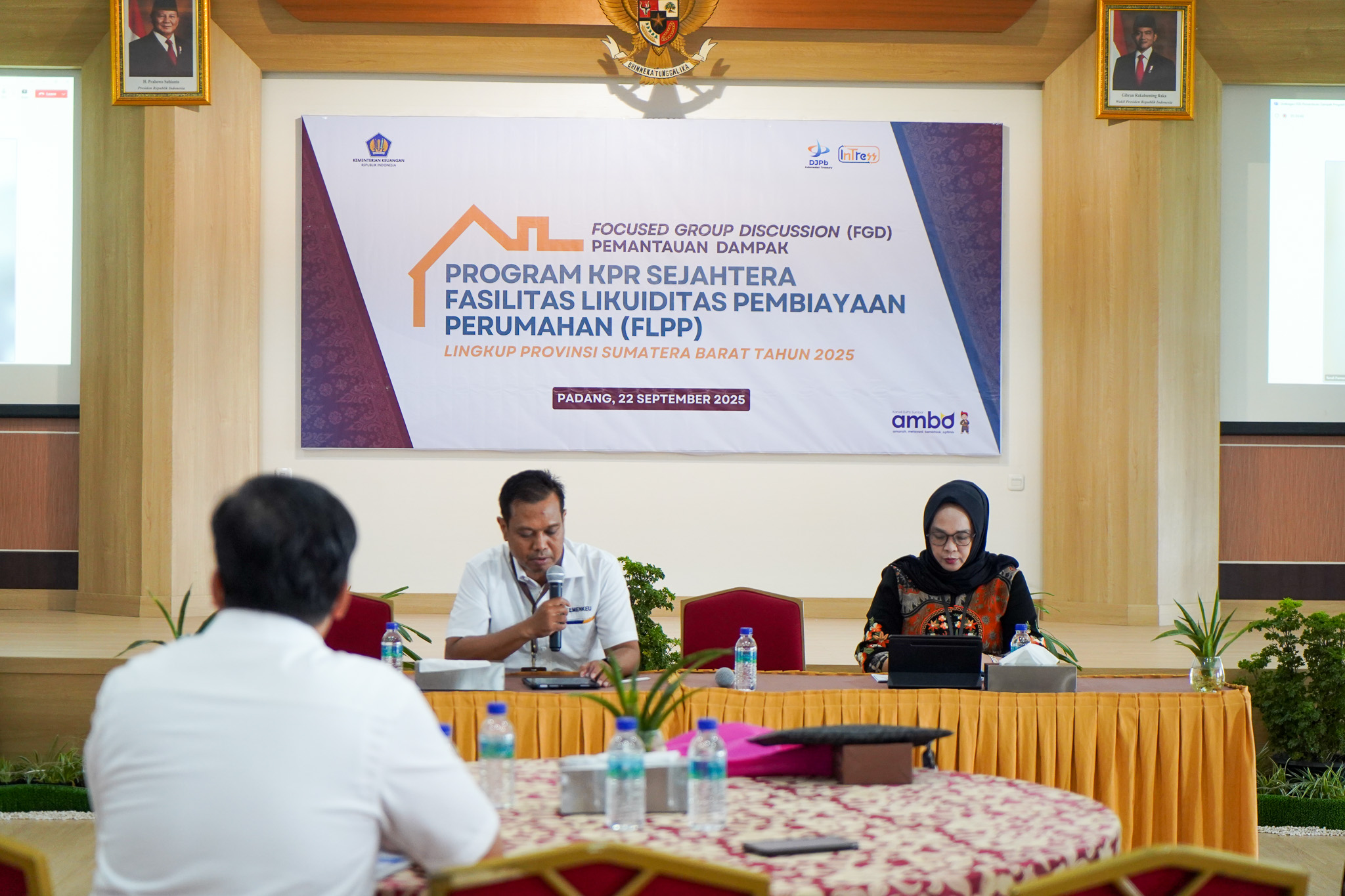 Padang, 22 September 2025 – Kantor Wilayah Direktorat Jenderal Perbendaharaan (Kanwil DJPb) Provinsi Sumatera Barat menyelenggarakan Focus Group Discussion (FGD) terkait pemantauan dampak Program Kredit Pemilikan Rumah (KPR) Sejahtera melalui skema Fasilitas Likuiditas Pembiayaan Perumahan (FLPP). Kegiatan yang dilaksanakan secara daring melalui Zoom Meeting ini melibatkan berbagai pemangku kepentingan lintas sektor.