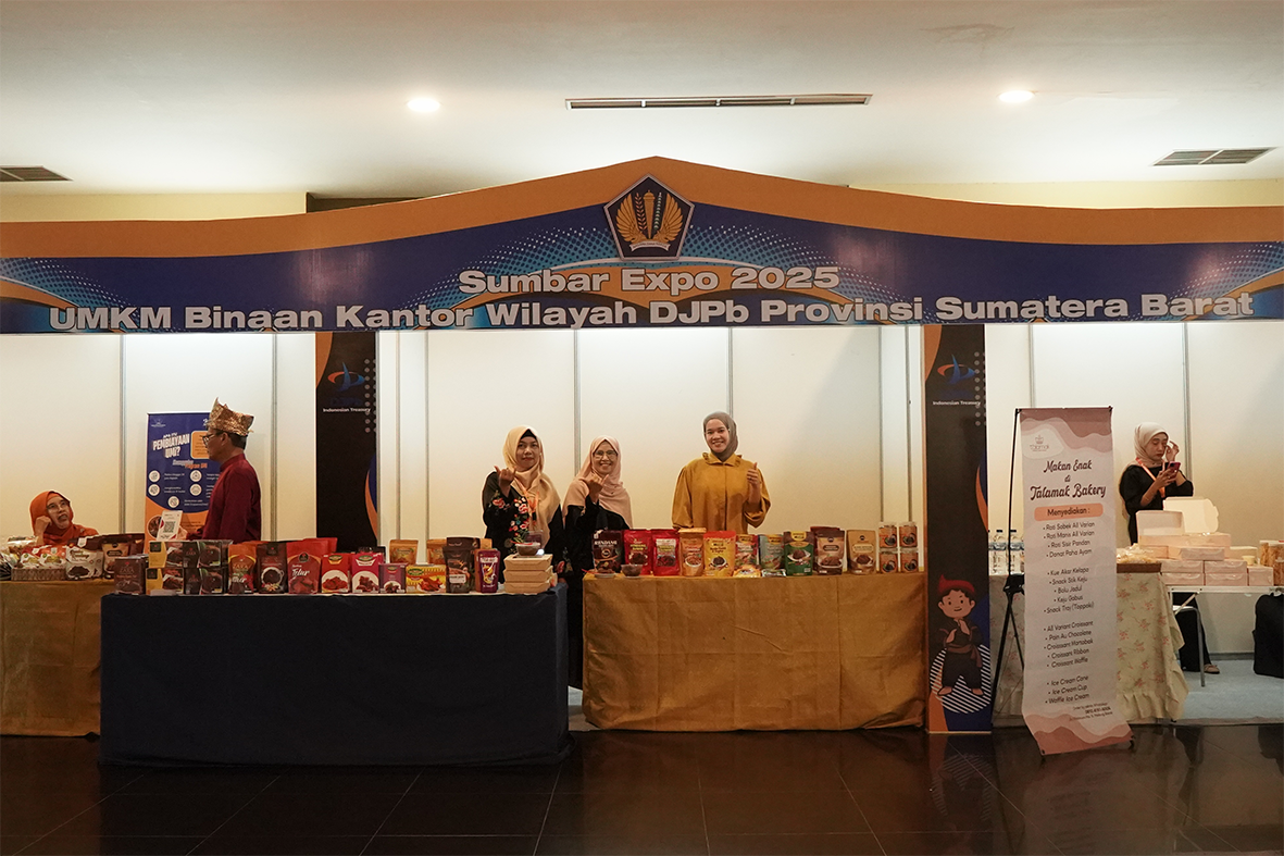 Padang, 28 Oktober 2025 - Kantor Wilayah Direktorat Jenderal Perbendaharaan (DJPb) Provinsi Sumatera Barat menampilkan enam UMKM binaan unggulan dalam ajang Sumbar Expo Komoditi Ekspor 2025 yang diselenggarakan di Hotel Truntum Padang. Kegiatan ini merupakan tindak lanjut kerja sama antara Kanwil DJPb Sumbar dengan Dinas Perindustrian dan Perdagangan Provinsi Sumatera Barat dalam rangka mendorong penguatan peran UMKM berorientasi ekspor.