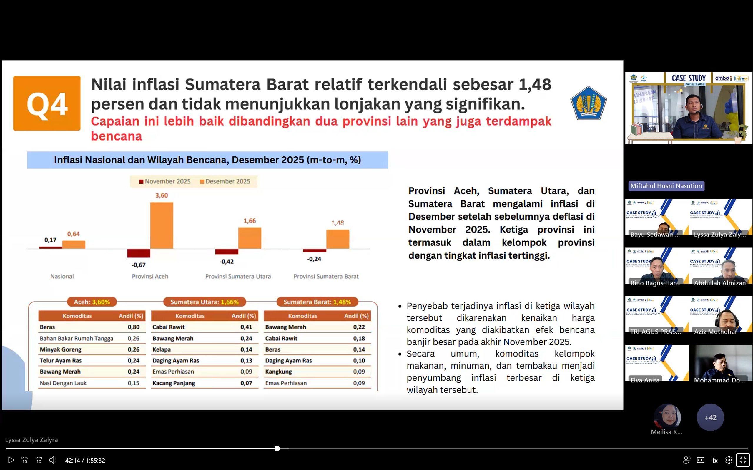 Kegiatan kemudian dilanjutkan dengan pemaparan materi oleh Local Expert Provinsi Sumatera Barat, Fajri Muharja, yang menjelaskan inflasi dari perspektif demand-pull inflation dan cost-push inflation. Dalam pemaparannya disampaikan bahwa kedua sumber inflasi tersebut dapat terjadi secara bersamaan dan saling memengaruhi, khususnya di daerah yang rentan terhadap fluktuasi harga pangan. Pemahaman atas karakteristik dan sumber tekanan inflasi dinilai penting dalam mendukung perumusan strategi pengendalian harga yang tepat melalui penguatan koordinasi lintas pemangku kepentingan.