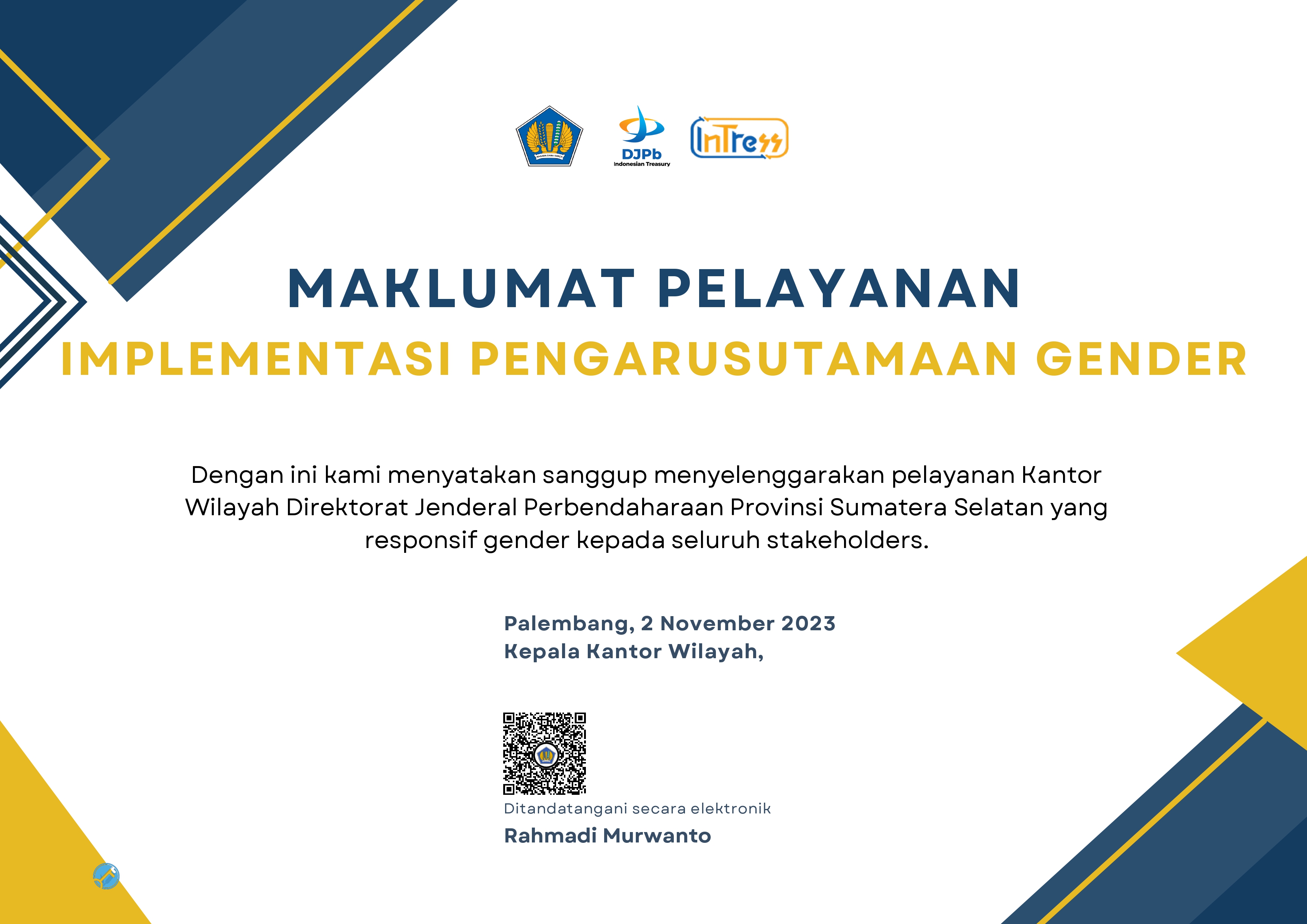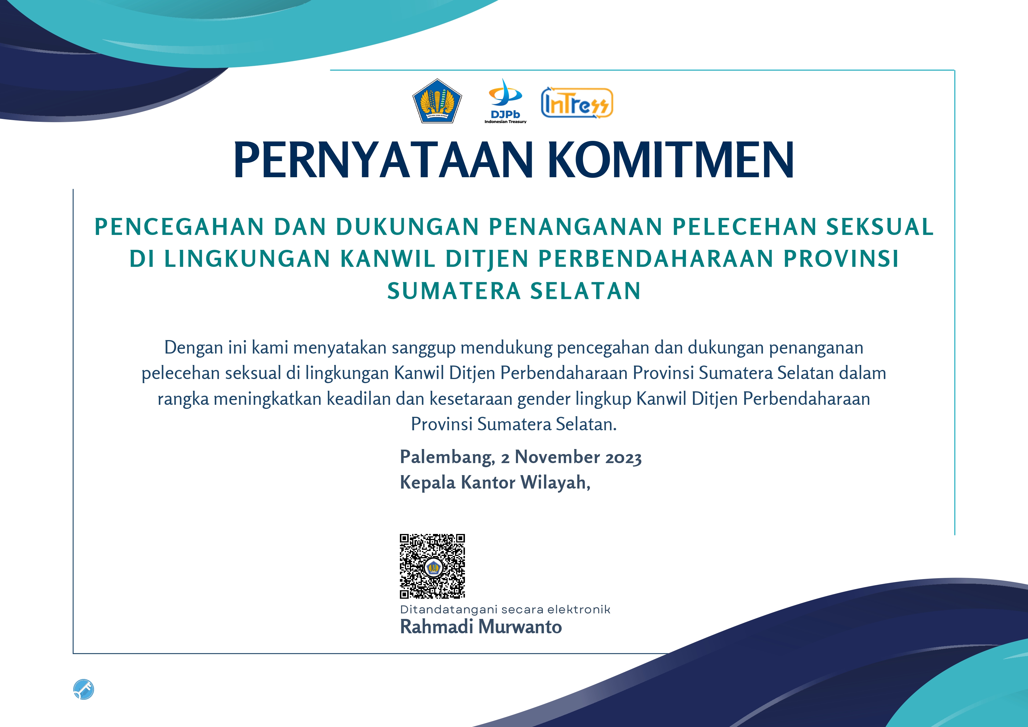 Sejak 2023, Kanwil DJPb Sumsel sudah mendapat predikat Zona Integritas Wilayah Birokrasi Bersih dan Melayani (WBBM).