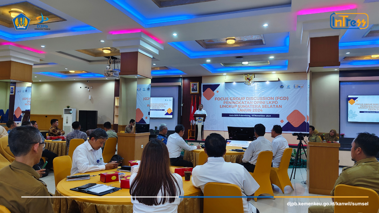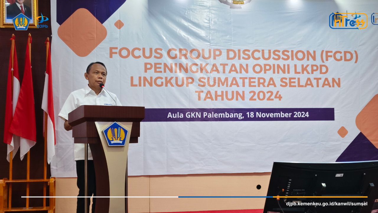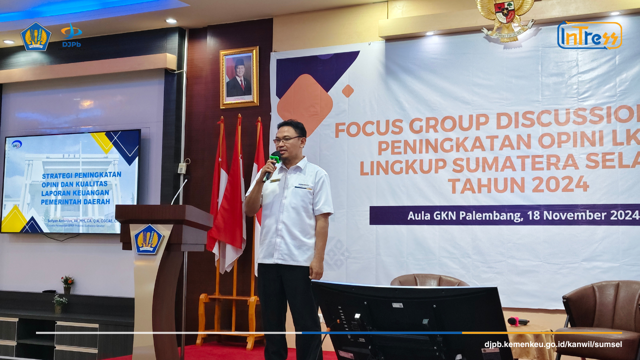 Palembang - Kanwil DJPb Sumatera Selatan, bersama Perwakilan BPKP Provinsi Sumatera Selatan, menggelar Focus Group Discussion (FGD) Peningkatan Kualitas Laporan Keuangan Pemerintah Daerah lingkup Sumsel Tahun 2024. Acara ini berlangsung pada Senin, 18 November 2024, di Aula Gedung Keuangan Negara (GKN) Palembang, dengan menghadirkan narasumber Kepala Perwakilan BPKP Sumsel Sofyan Antonius.
