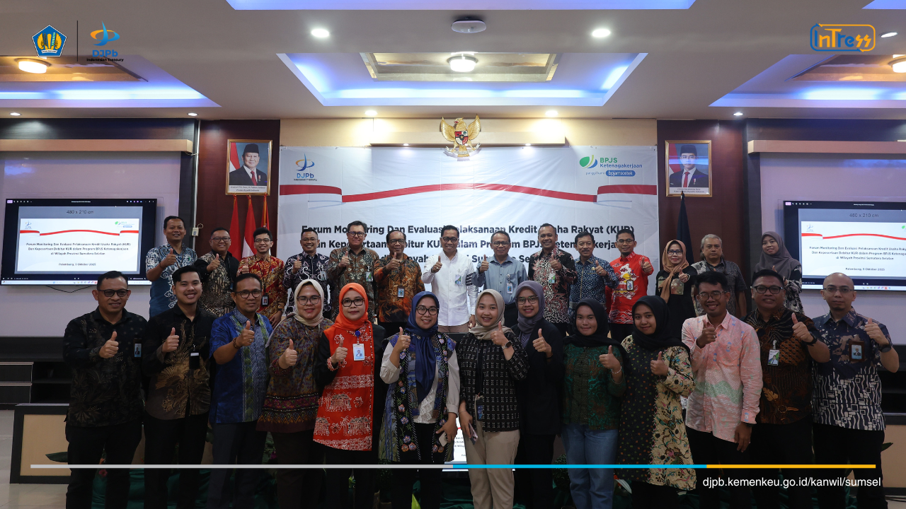 Palembang, 9 Oktober 2025 - Kanwil DJPb Sumsel berkolaborasi dengan BPJS Ketenagakerjaan melaksanakan Forum Monitoring dan Evaluasi Pelaksanaan KUR dan Kepesertaan Debitur KUR dalam Program BPJS Ketenagakerjaan di Wilayah Provinsi Sumatera Selatan. Dalam kegiatan yang diselenggarakan hybrid di Aula Gedung Keuangan Negara Palembang dan secara daring melalui teams meeting ini, diikuti oleh perwakilan OJK, Dinas Koperasi dan UKM, dan Perbankan seluruh kab/kota di lingkup Sumatera Selatan.