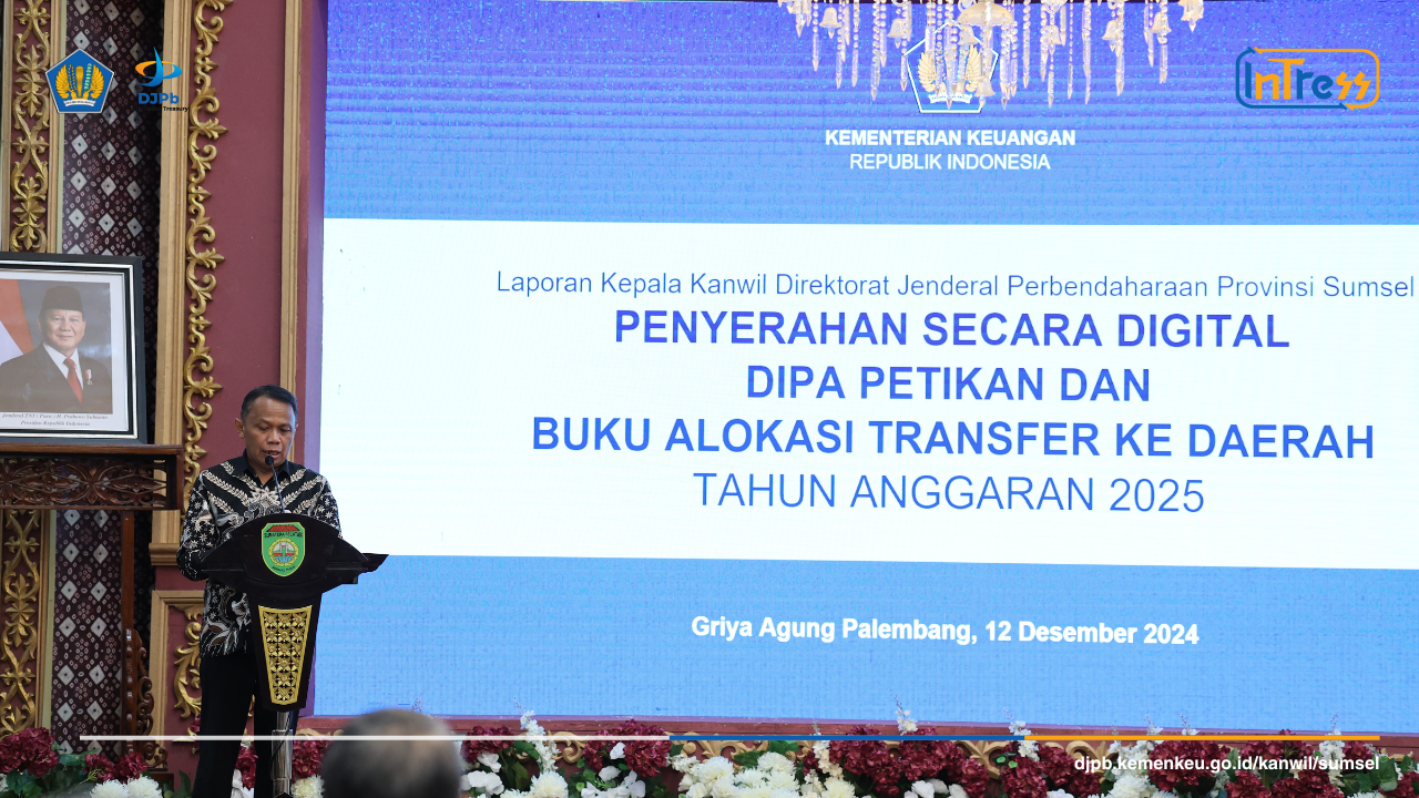 Palembang, 12 Desember 2024 – Kegiatan Penyerahan Daftar Isian Pelaksanaan Anggaran (DIPA) dan Buku Alokasi Transfer ke Daerah (TKD) tahun 2025 dilaksanakan secara digital. Daftar Isian Pelaksanaan Anggaran (DIPA) dan Buku Alokasi Transfer ke Daerah (TKD) merupakan dokumen anggaran yang berfungsi sebagai acuan dalam berbagai program pemerintah di tahun 2025. Didampingi oleh Kepala Kanwil Direktorat Jenderal Perbendaharaan Provinsi Sumatera Selatan, Rahmadi Murwanto, Pj. Gubernur Sumatera Selatan, Elen Setiadi, S.H, M.S.E menyerahkan DIPA Kementerian/Lembaga serta Buku Alokasi TKD untuk wilayah Provinsi Sumatera Selatan kepada para pejabat penanggung jawab pelaksana anggaran di Bumi Sriwijaya.