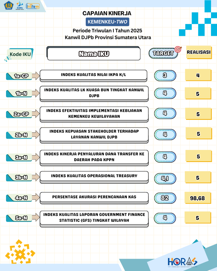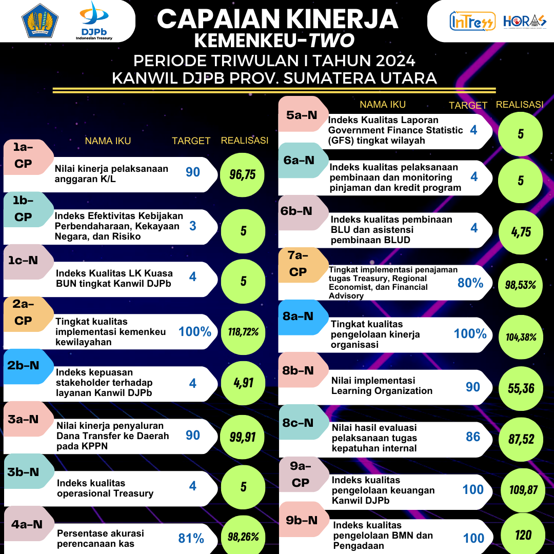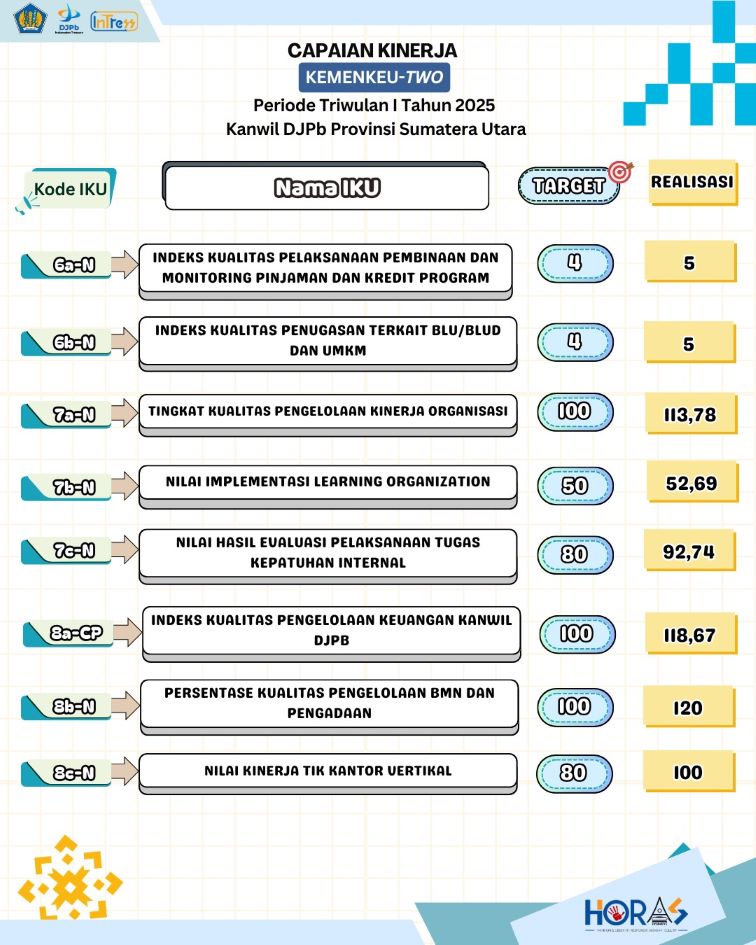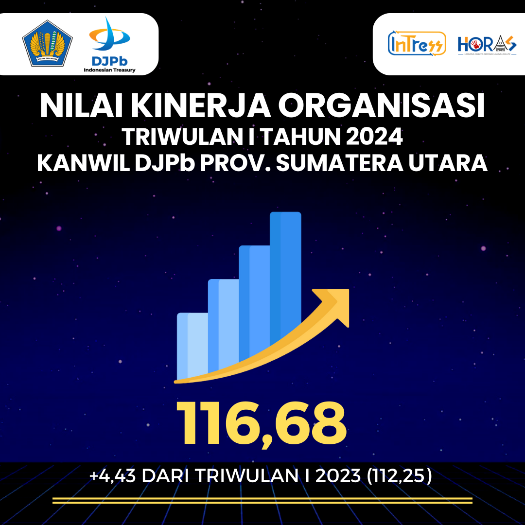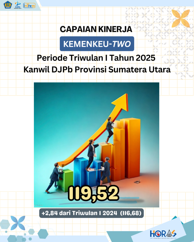 Pada tahun 2025, capaian kinerja Kanwil DJPb Provinsi Sumatera Utara tercatat sangat baik, capaian seluruh Indikator Kinerja Utama melampaui target yang ditetapkan. Nilai Kinerja Organisasi (NKO) tahun 2025 sebesar 119,60 meningkat 2,79 poin (2,39%) dibandingkan tahun 2024. Disamping itu, tercipta berbagai inovasi untuk simplifikasi kerja dan peningkatan kualitas layanan serta berhasil meraih berbagai prestasi lingkup DJPb.