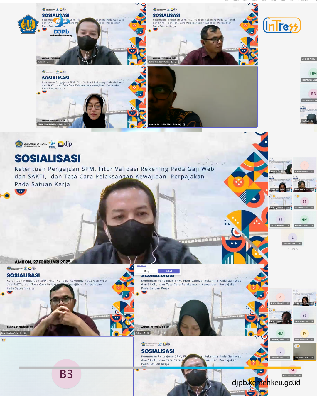 Dalam rangka meningkatkan akurasi penerbitan Surat Perintah Membayar (SPM) dan Kepatuhan Kewajiban Perpajakan Satuan Kerja, KPPN Ambon bekerja sama dengan KPP Pratama Ambon melaksanakan sosialisasi secara online, pada Kamis, 27 Februari 2025 pukul 09.00 s.d. 12.15 WIT. Kegiatan ini dihadiri oleh Bendahara Pengeluaran, PPABP, Operator Pembayaran/Komitmen pada masing-masing Satuan kerja pada lingkup KPPN Ambon.