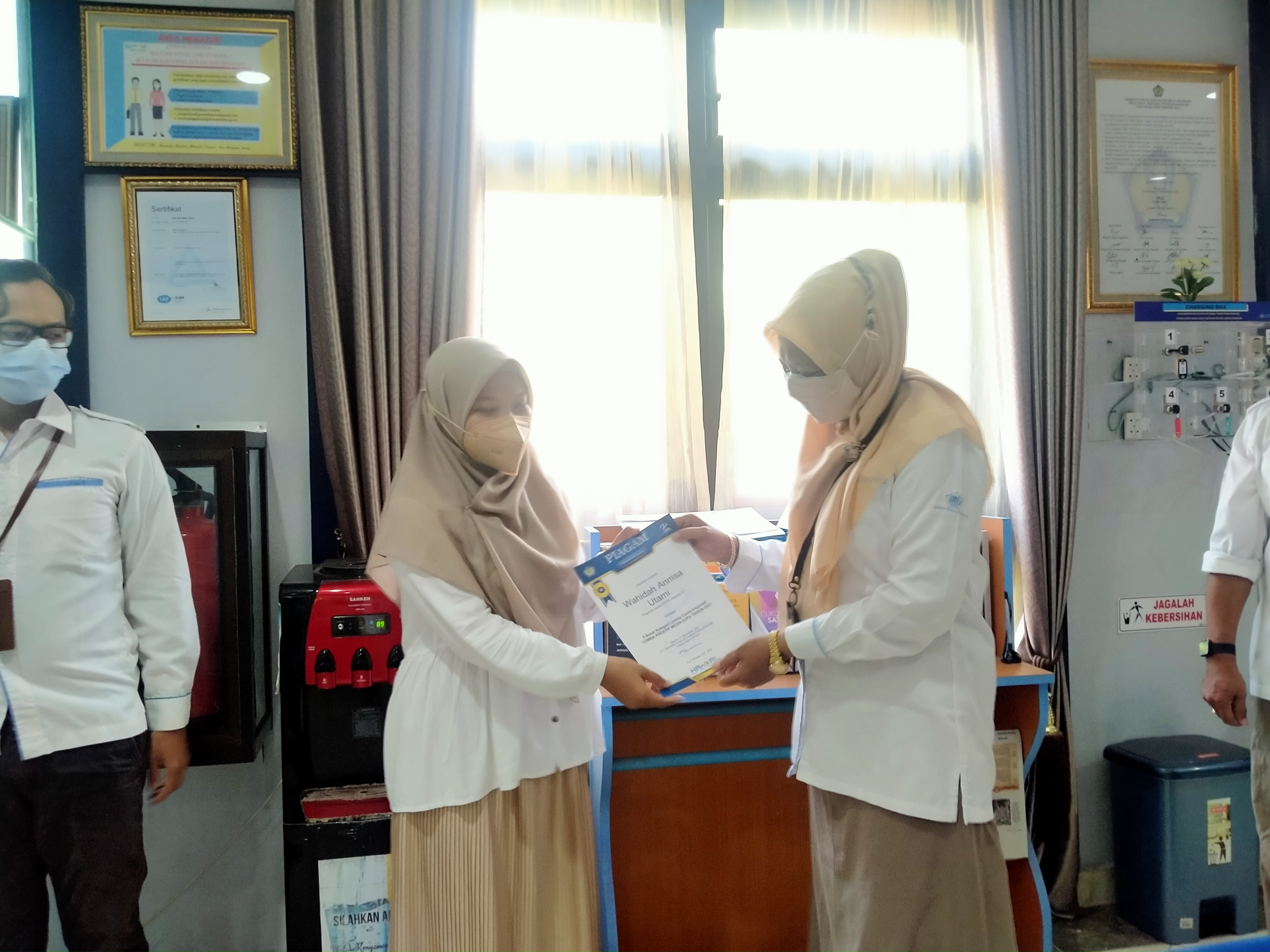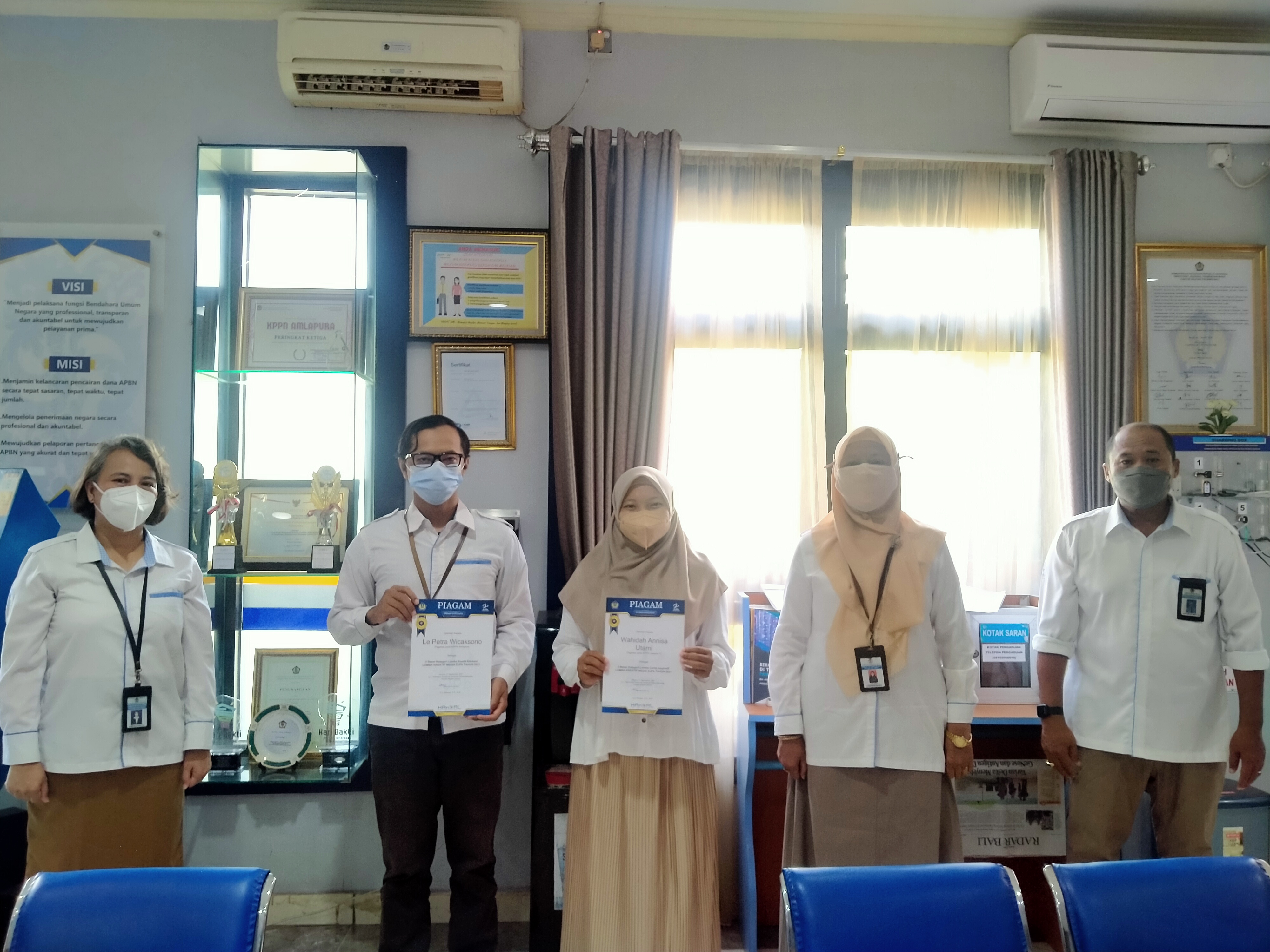 Di morning briefing (Kamis, 4 November 2021), dilakukan penyerahan piagam penghargaan kepada pegawai KPPN Amlapura, Le Petra Wicaksono dan Wahidah Annisa Utami yang meraih 5 besar pada Lomba Kreatif Media DJPb tahun 2021.