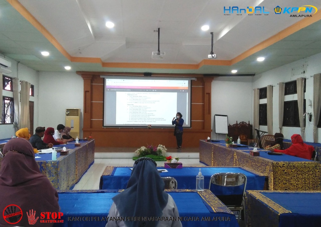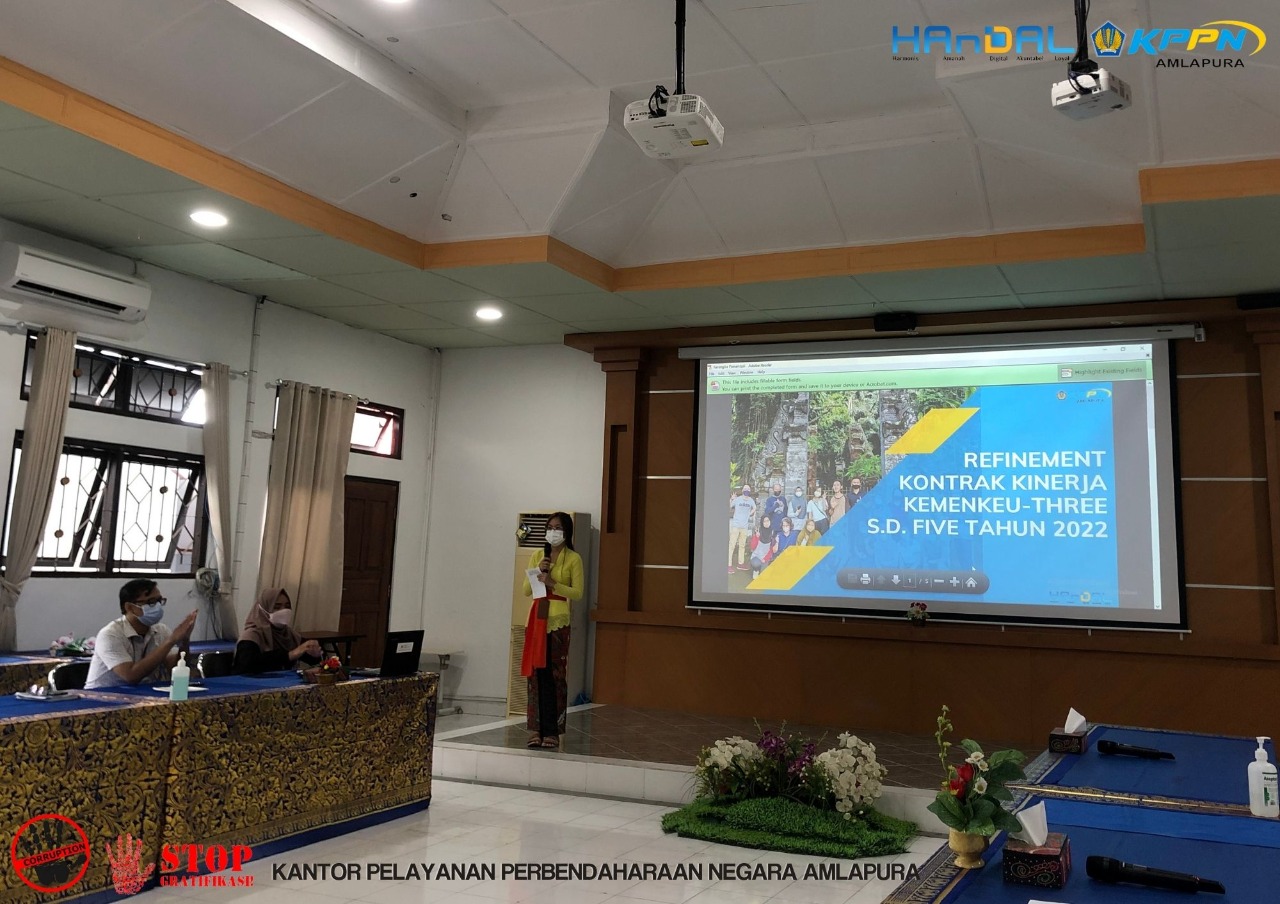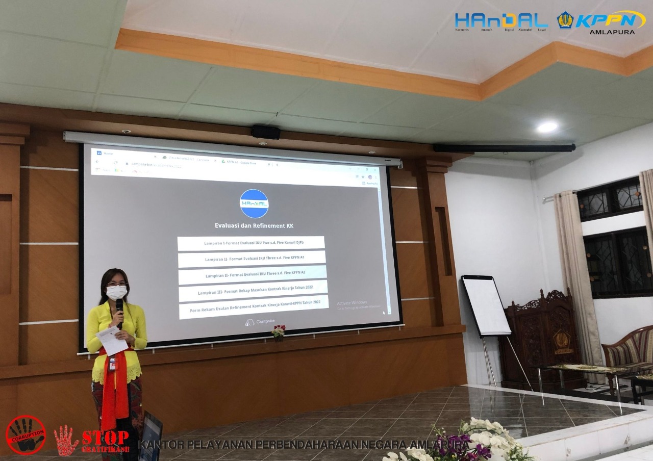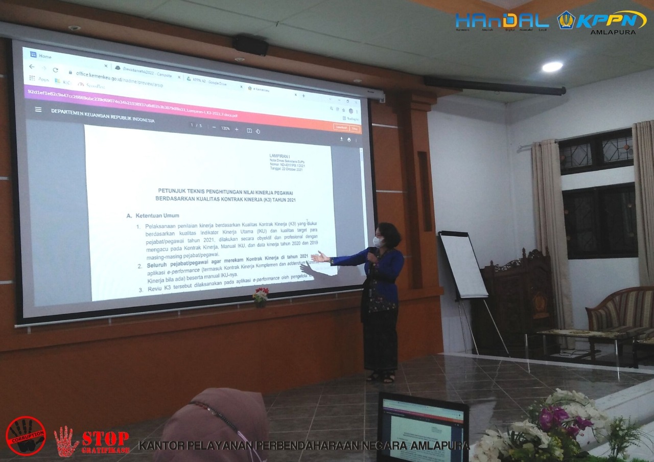 Dalam rangka penyusunan kontrak kinerja pegawai, perlu dilaksanakan proses refinement terhadap kontrak kinerja yang bertujuan untuk menyelaraskan pengukuran kinerja dengan dinamika serta kebutuhan organisasi serta Kontrak Kinerja Kemenkeu-One Ditjen Perbendaharaan. Sejalan dengan hal tersebut, pada Kamis, 25 November dilaksanakan Rapat Pembahasan dan Finalisasi Refinement IKU Tahun 2022. Selanjutnya, sehubungan dengan pelaksanaan penilaian kinerja, dilaksanakan Sosialisasi Petunjuk Teknis Penghitungan Nilai Kinerja Pegawai berdasarkan Kualitas Kontrak Kinerja Tahun 2021. Kegiatan ini diikuti oleh seluruh pejabat/pegawai KPPN Amlapura.