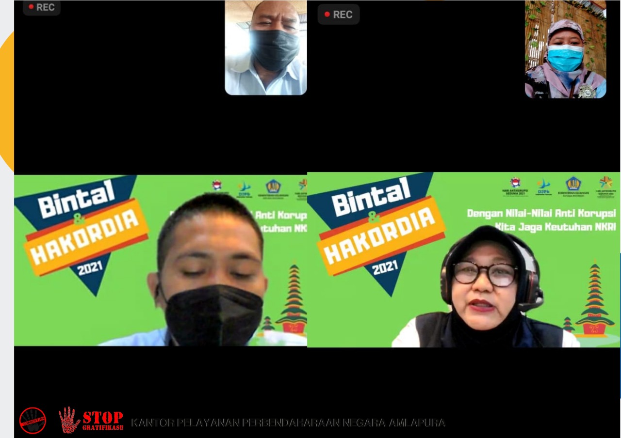Webinar kedua yaitu Kegiatan Bimbingan Mental Juang dan Peringatan Hari Anti Korupsi Sedunia (Hakordia) Kanwil DJPb Provinsi Bali Tahun 2021. Kegiatan Bimbingan Mental Juang merupakan tindak lanjut dari implementasi Gerakan nasional Revolusi Mental Kementerian Keuangan. Sementara itu kegiatan peringatan Hari Anti Korupsi Sedunia (Hakordia) merupakan kegiatan yang dilakukan untuk memperingati Hakordia dan juga mengingatkan kembali mengenai nilai nilai anti korupsi dalam bentuk game interaktif yang dilakukan secara online dan beberapa pegawai KPPN Amlapura berkesempatan memperoleh nilai tertinggi pada game tersebut.