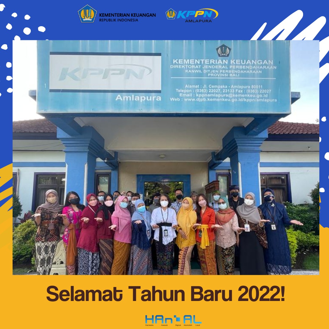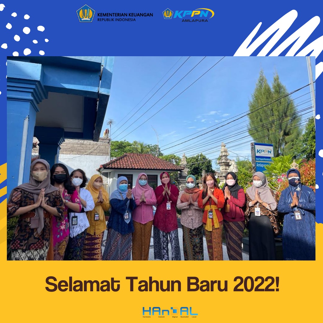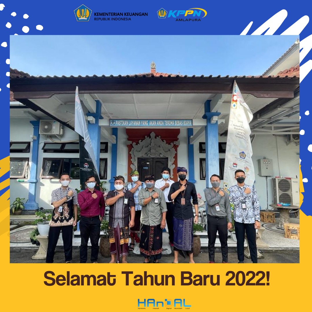 Segenap insan perbendaharaan di KPPN Amlapura mengucapkan Selamat Tahun Baru 2022. Terima kasih diucapkan kepada mitra KPPN Amlapura untuk sinergi yang telah terjalin dan kinerja dalam mengawal pelaksanaan anggaran pada tahun 2021. Semoga di tahun 2022, Tuhan YME memampukan kita untuk bersinergi dan berkinerja serta berprestasi lebih baik lagi. Amin.