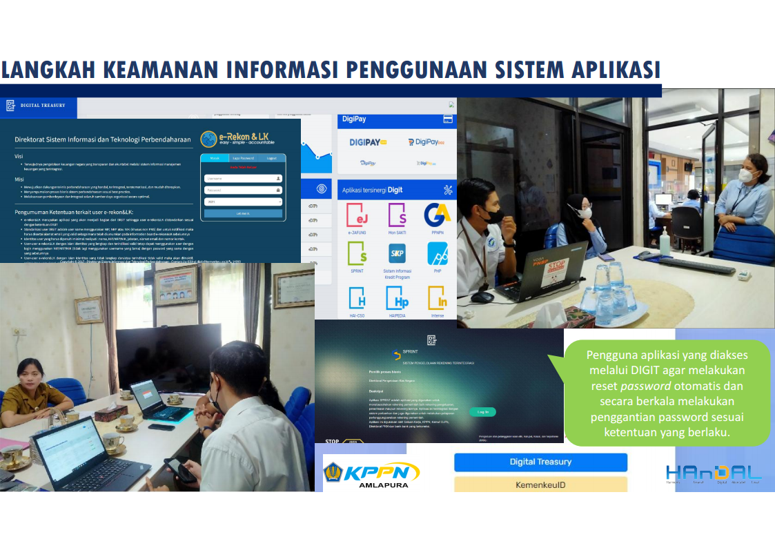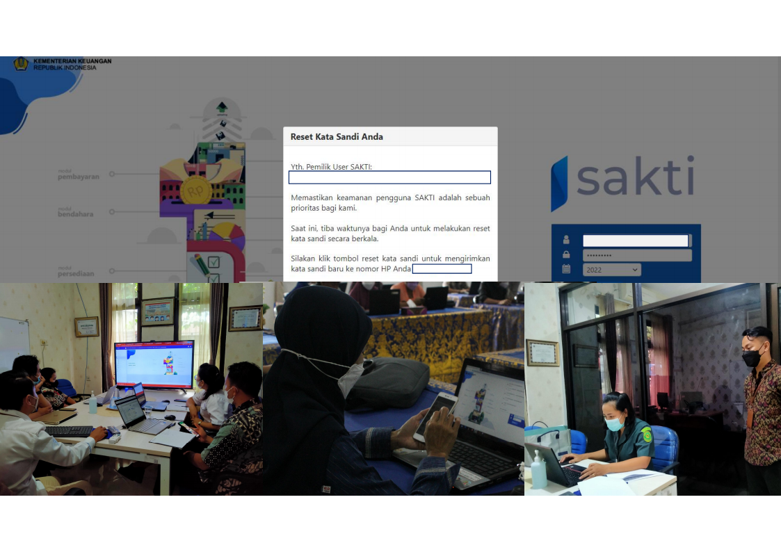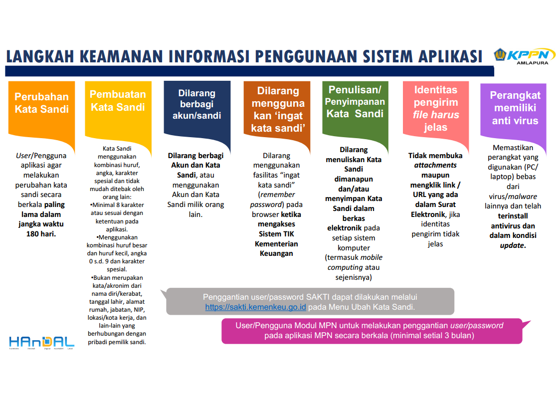 Dalam upaya menjaga keamanan penggunaan sistem aplikasi keuangan milik Kementerian Keuangan mengingat semakin meningkatnya ancaman dan gangguan terhadap keamanan informasi, dihimbau agar para user/pengguna sistem aplikasi Kementerian Keuangan melakukan perubahan password secara berkala. Khusus untuk user/pengguna SAKTI untuk melakukan penggantian user password pada aplikasi SAKTI secara berkala minimal setiap 3 bulan. Penggantian user password SAKTI dapat dilakukan melalui https://sakti.kemenkeu.go.id/ pada Menu Ubah Kata Sandi.