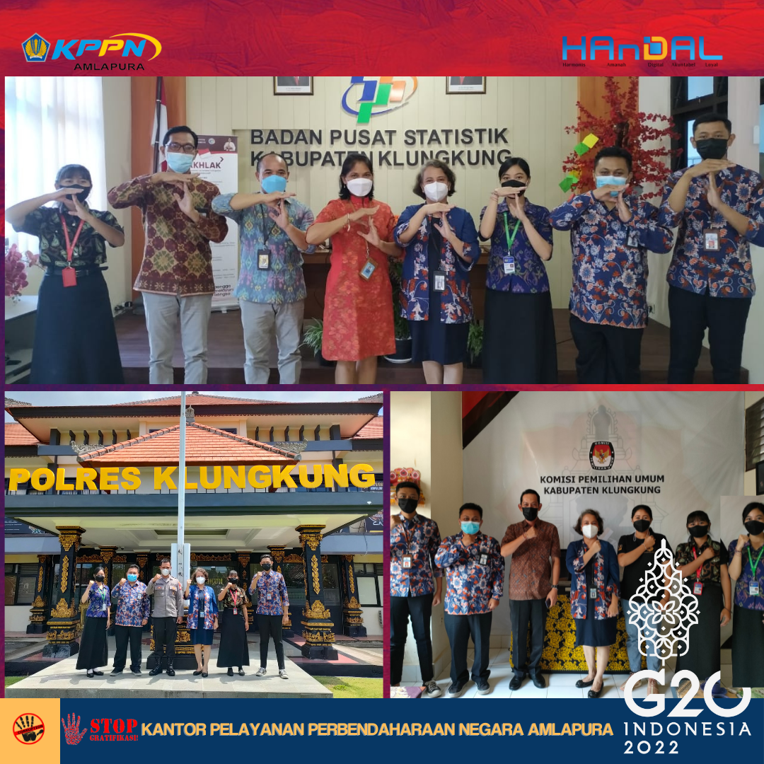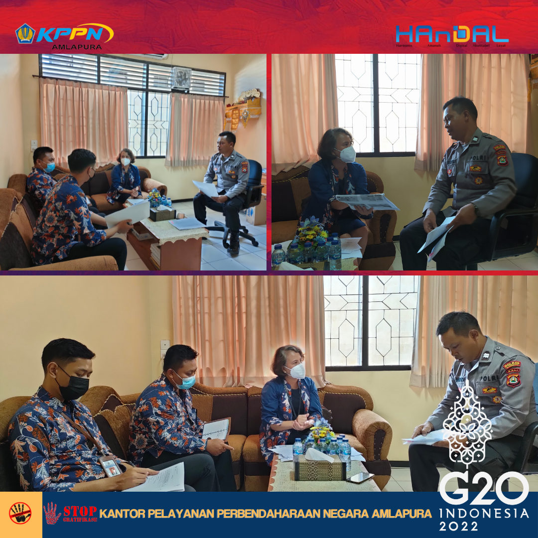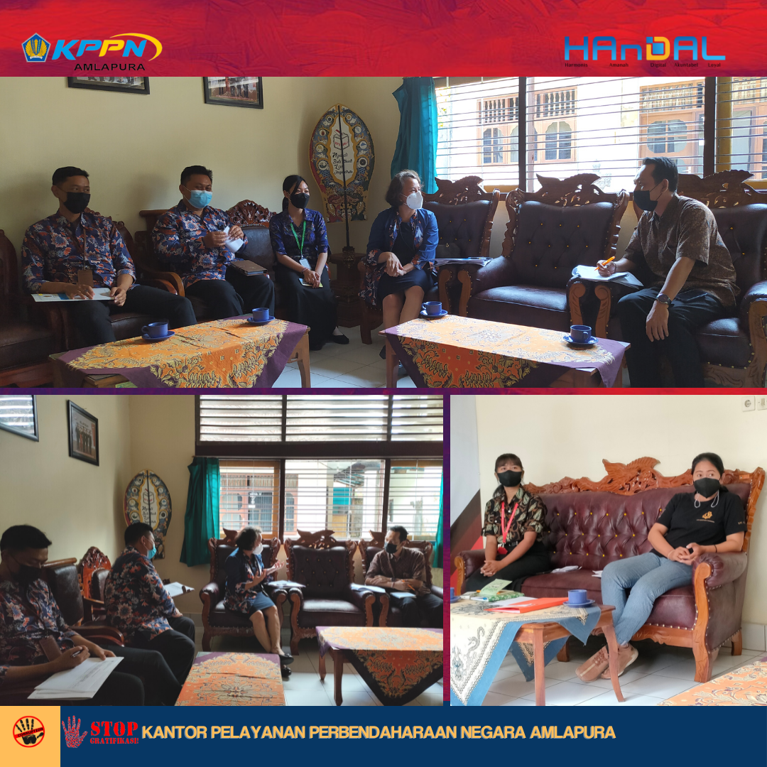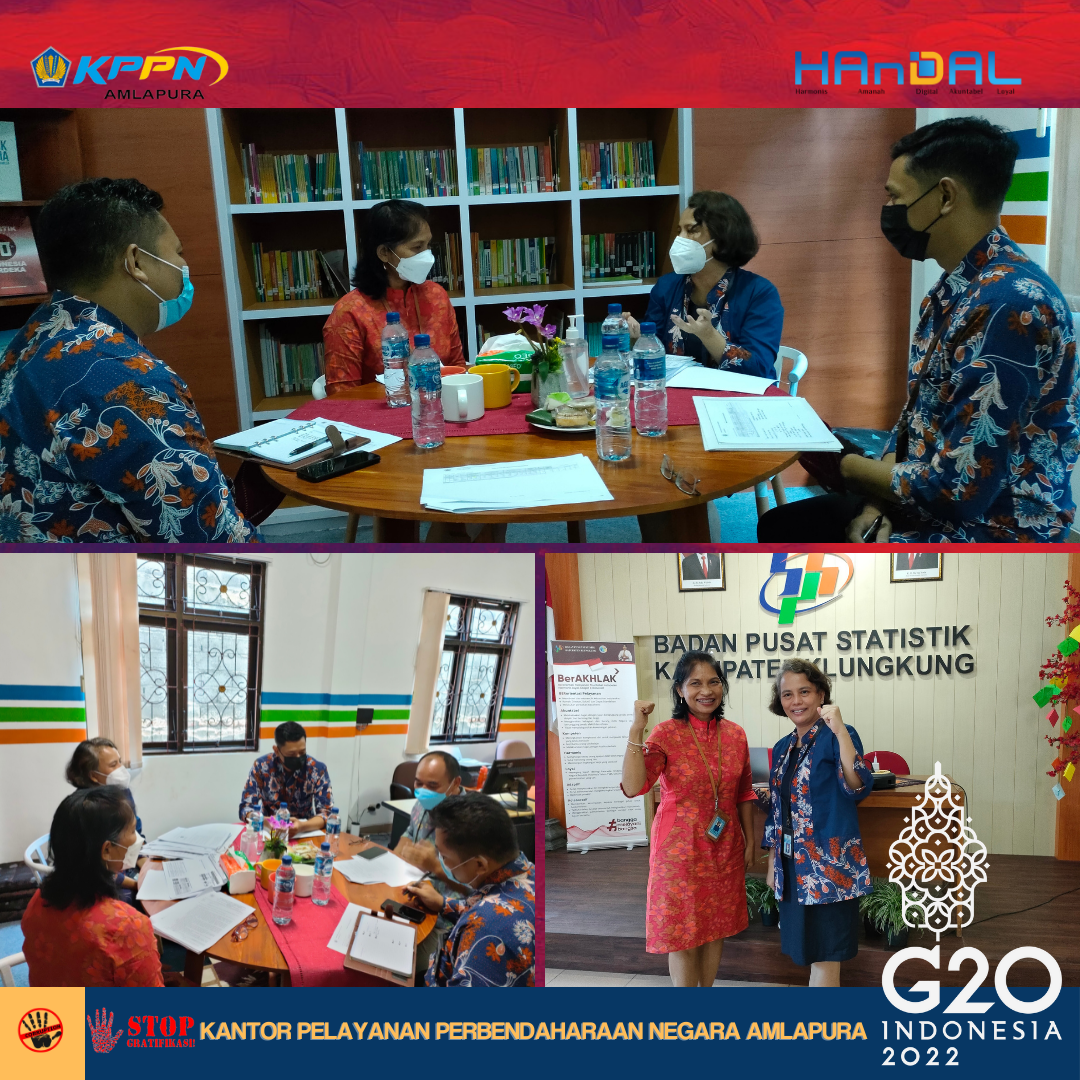Masih dalam rangkaian pemberian apresiasi atas kinerja pelaksanaan anggaran dan sinergi yang telah terjalin dengan mitra kerja KPPN Amlapura selama tahun 2021, hari Jumat tanggal 11 Maret 2022 Tim Monev KPPN beserta dengan siswa PKL PKN STAN mengunjungi Satker Badan Pusat Statistik Kab. Klungkung, Polres Klungkung, dan KPU Kab. Klungkung. Secara umum, Kepala KPPN Amlapura menyampaikan apresiasi dan terima kasih atas kinerja dan sinergi dengan satker yang tentunya mempengaruhi kinerja KPPN Amlapura. Selanjutnya, Tim Monev KPPN Amlapura melakukan pembinaan informasi tentang Reformulasi IKPA 2022 dan strategi persiapan pelaksanaan penilaiannya pada tahun 2022, pembinaan terkait standardisasi kompetensi jabatan PPK dan PPSPM, implementasi digipay dan diskusi mengenai SAKTI.