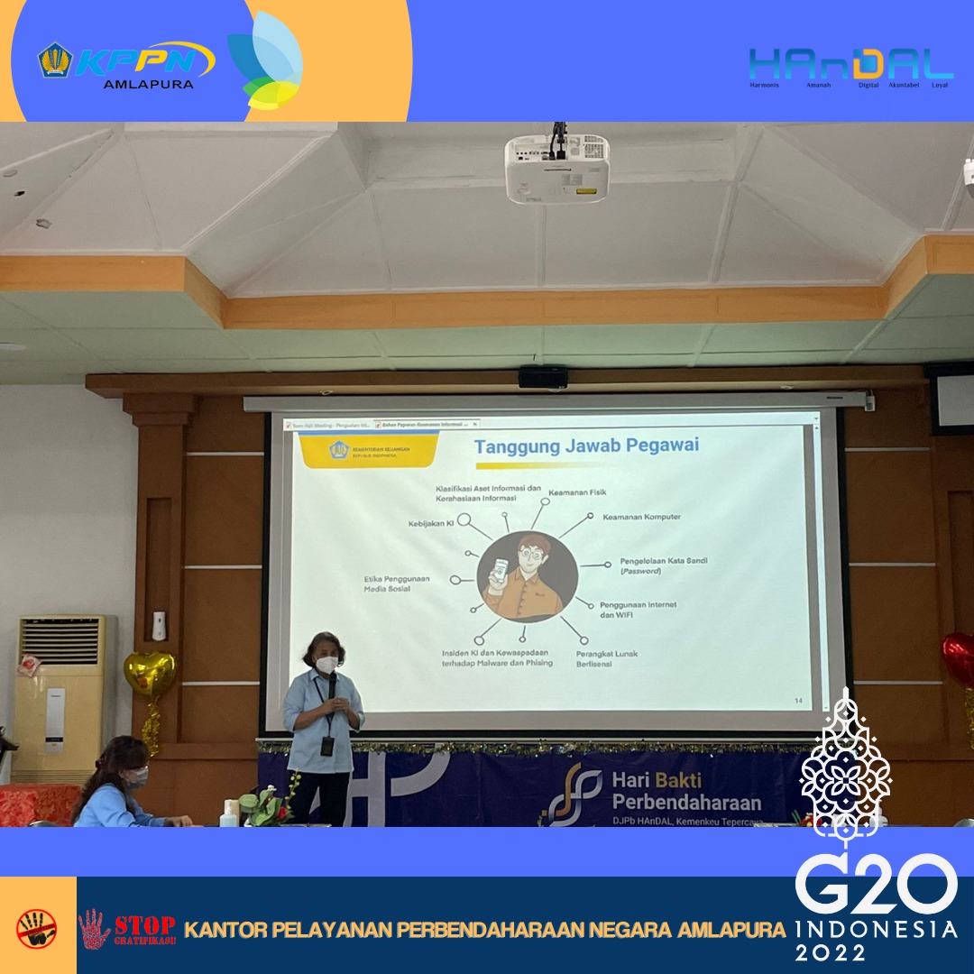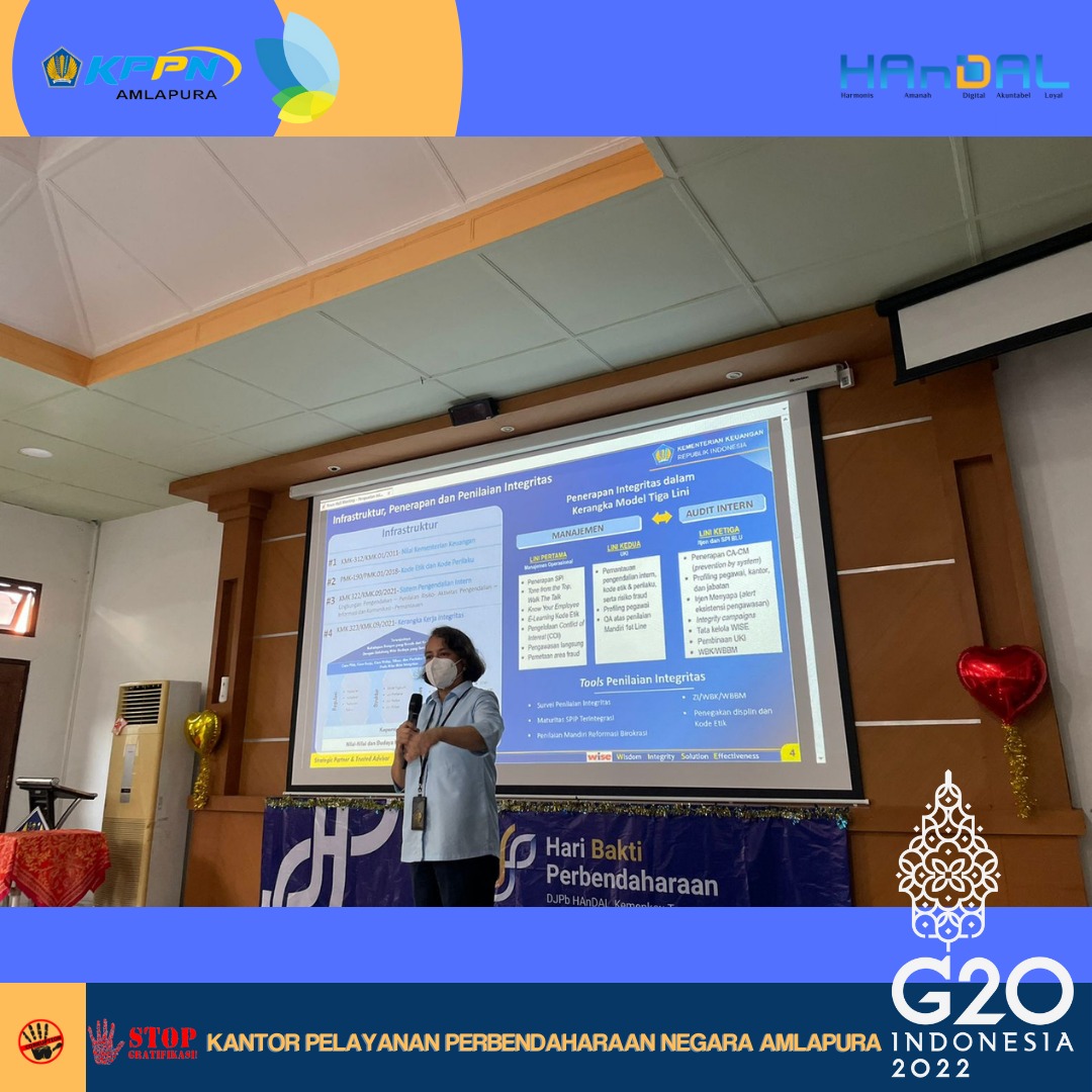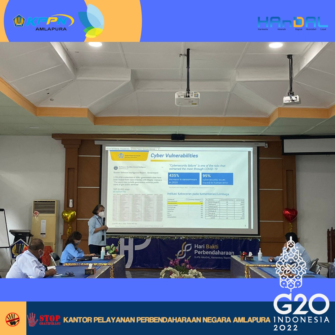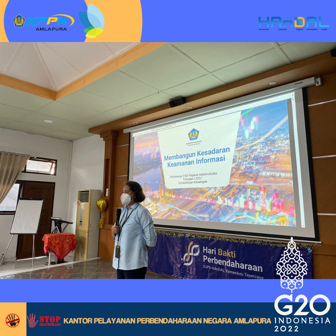 Dalam rangka implementasi Surat Edaran Menteri Keuangan Nomor SE-3/MK.1/2020,pada hari Rabu, 23 Maret 2022 KPPN Amlapura mengadakan Focus Group DIscussion Pejabat Administrator Triwulan I Tahun 2022. Pada kesempatan kali ini Kepala KPPN Amlapura, Ibu Masta Boru Manurung menyampaikan materi mengenai Penguatan integritas Kementerian Keuangan Tahun 2022 dan IT Security Awareness. Acara dilanjutkan dengan pemaparan mengenai Duta Transformasi Sebagai Titik Penyebaran. Materi ini disampaikan oleh Lighthouse Team KPPN Amlapura, Emyliana Rosyadah. Diharapkan duta transformasi dapat menjadi agen perubahan dalam mengawal transformasi kelembagaan di unit kerjanya.
