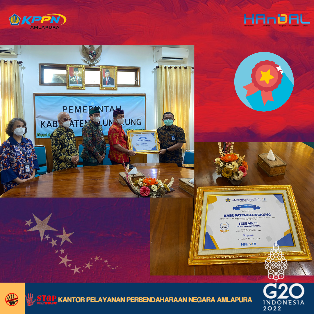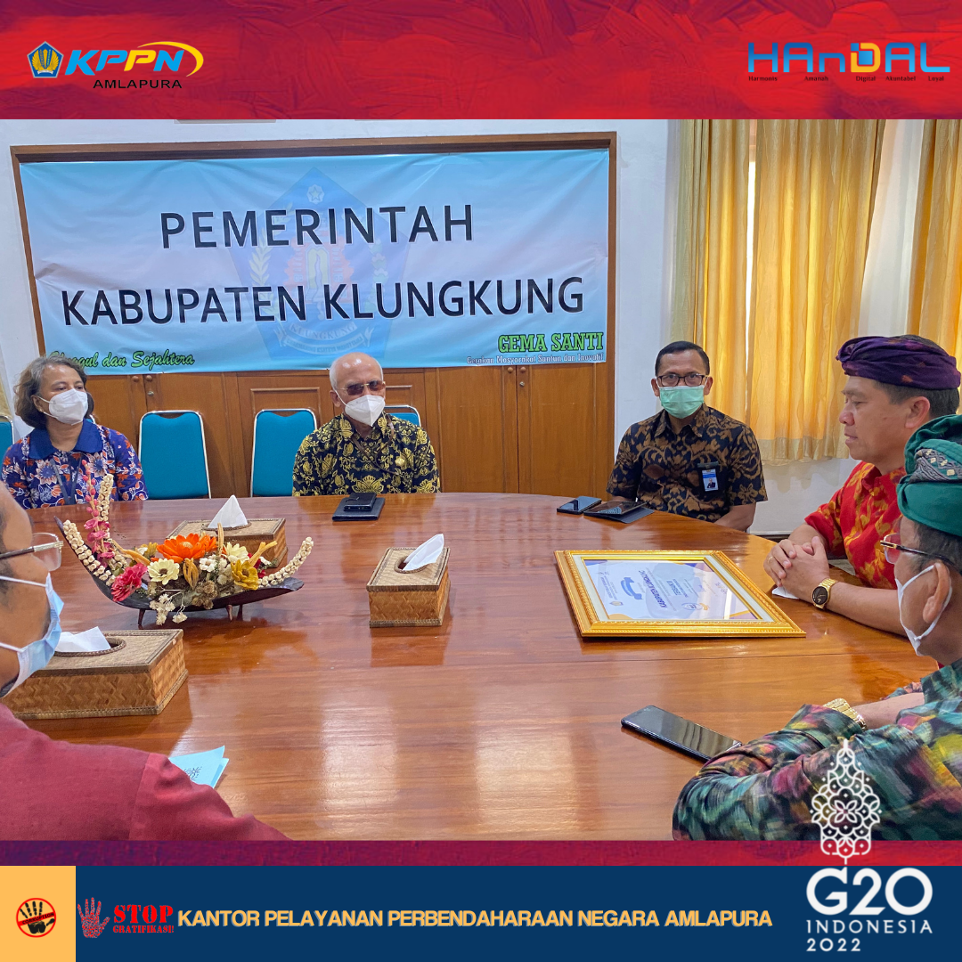 Pada hari Jumat tanggal 8 April 2022, Kepala Kanwil Ditjen Perbendaharaan, Teguh Dwi Nugroho, bersama dengan tim didampingi dengan Kepala KPPN Amlapura menyerahkan piagam penghargaan dari Direktur Jenderal Perbendaharaan atas kinerja Pemda Klungkung dalam Penyaluran DAK Fisik Tercepat Ketiga Tingkat Kabupaten/Kota tahun 2021.