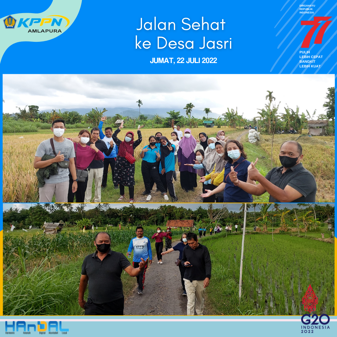 Pada hari Jumat tanggal 22 Juli 2022, KPPN Amlapura melaksanakan kegiatan Jalan Sehat ke Desa Jasri. Seluruh pegawai menikmati perjalanan dengan penuh semangat dan suka cita dengan pemandangan sawah. Rute jalan sehat kali ini berakhir di Pantai Jasri.