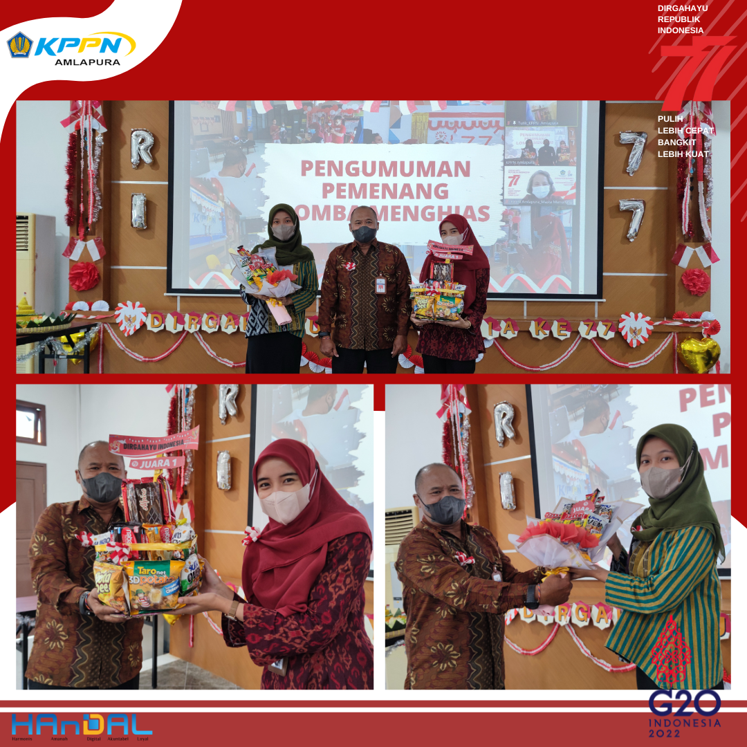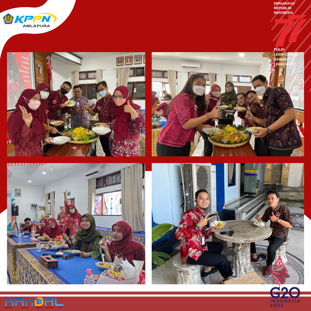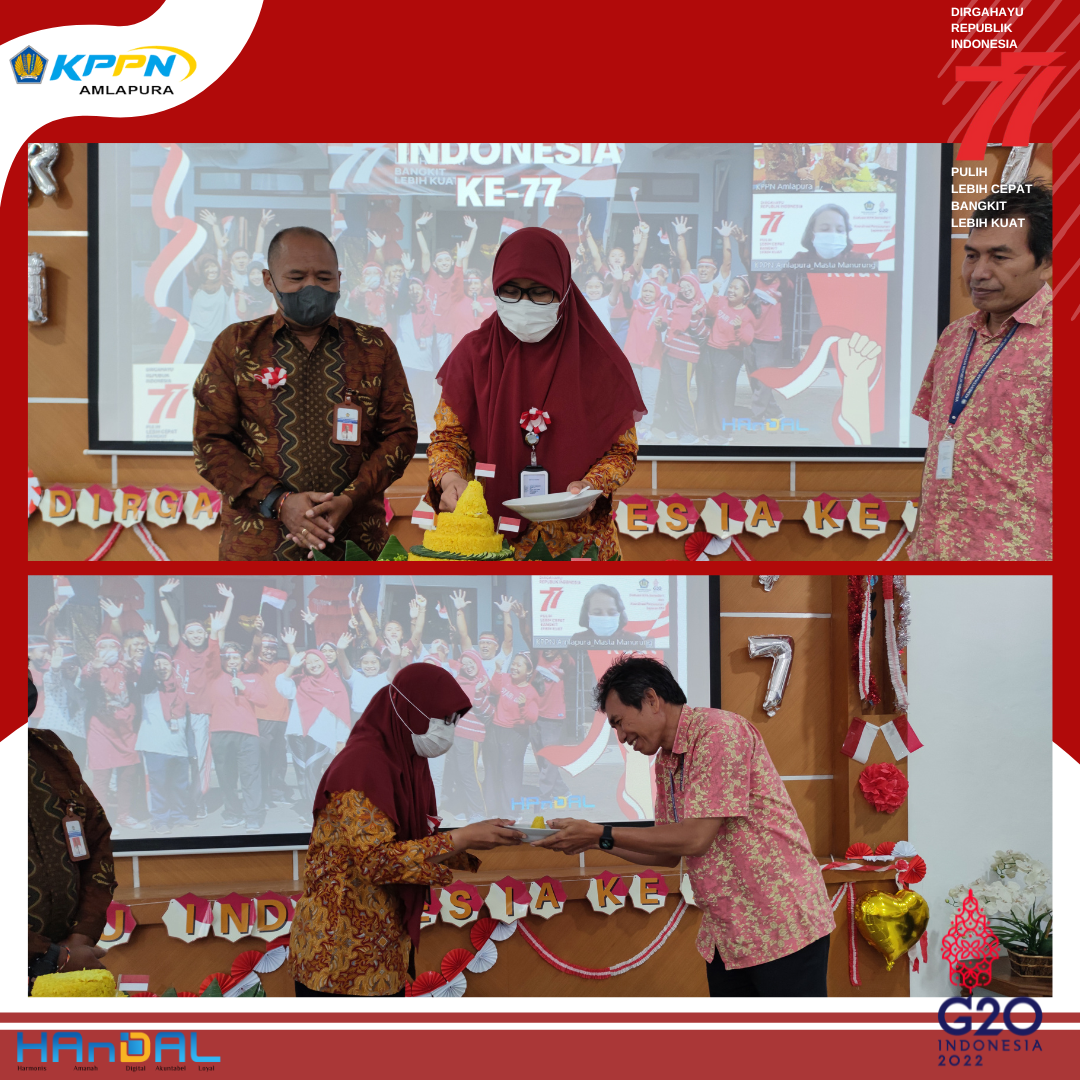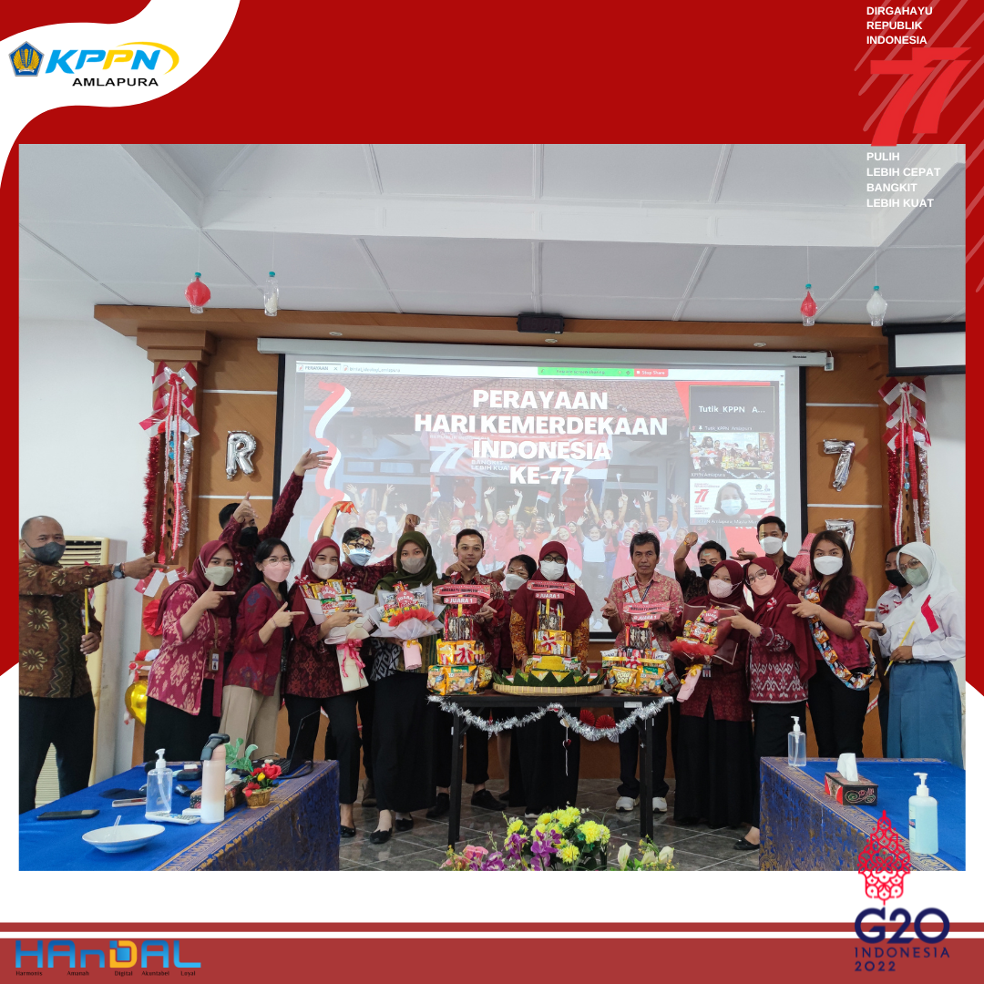 Memperingati Hari Kemerdekaan RI pada Rabu, 17 Agustus 2022, telah dilaksanakan kegiatan Pembinaan Mental Ideologi dan Perayaan Hari Kemerdekaan RI ke-77 oleh KPPN Amlapura. Dalam kegiatan ini disampaikan materi tentang wawasan kebangsaan Indonesia oleh Kepala Kantor, Masta Boru Manurung. Selanjutnya adalah pengumuman pemenang lomba-lomba perayaan Hari Kemerdekaan RI yang terdiri dari mini games, lomba yel-yel dan lomba menghias. Kegiatan diakhiri dengan pemotongan tumpeng dan foto bersama.