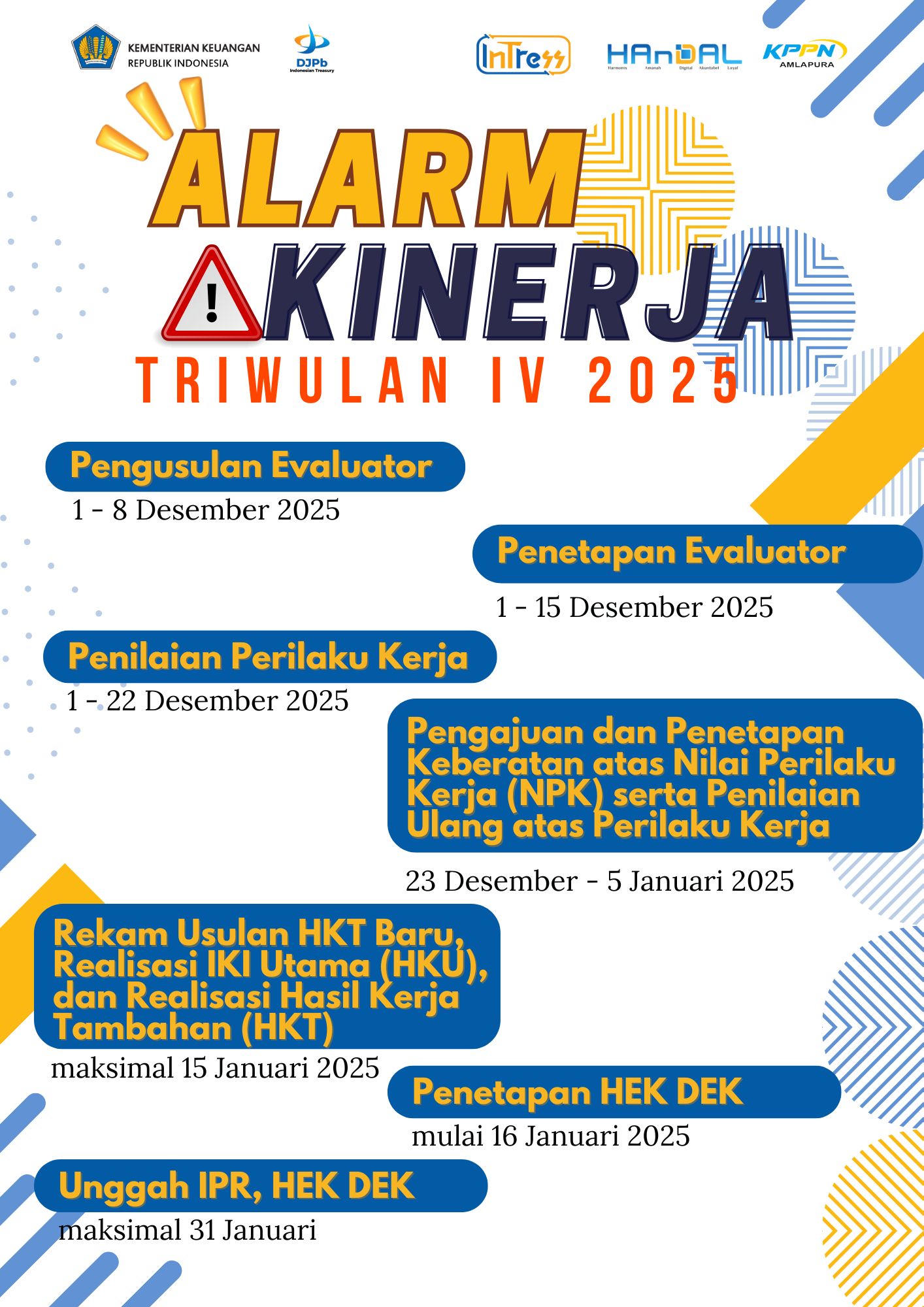 Dalam rangka memastikan kelancaran dan ketepatan waktu pelaksanaan manajemen kinerja pegawai, KPPN Amlapura mengingatkan seluruh pejabat dan pegawai untuk memperhatikan tahapan Alarm Kinerja Triwulan IV Tahun 2025 sesuai dengan jadwal yang telah ditetapkan.