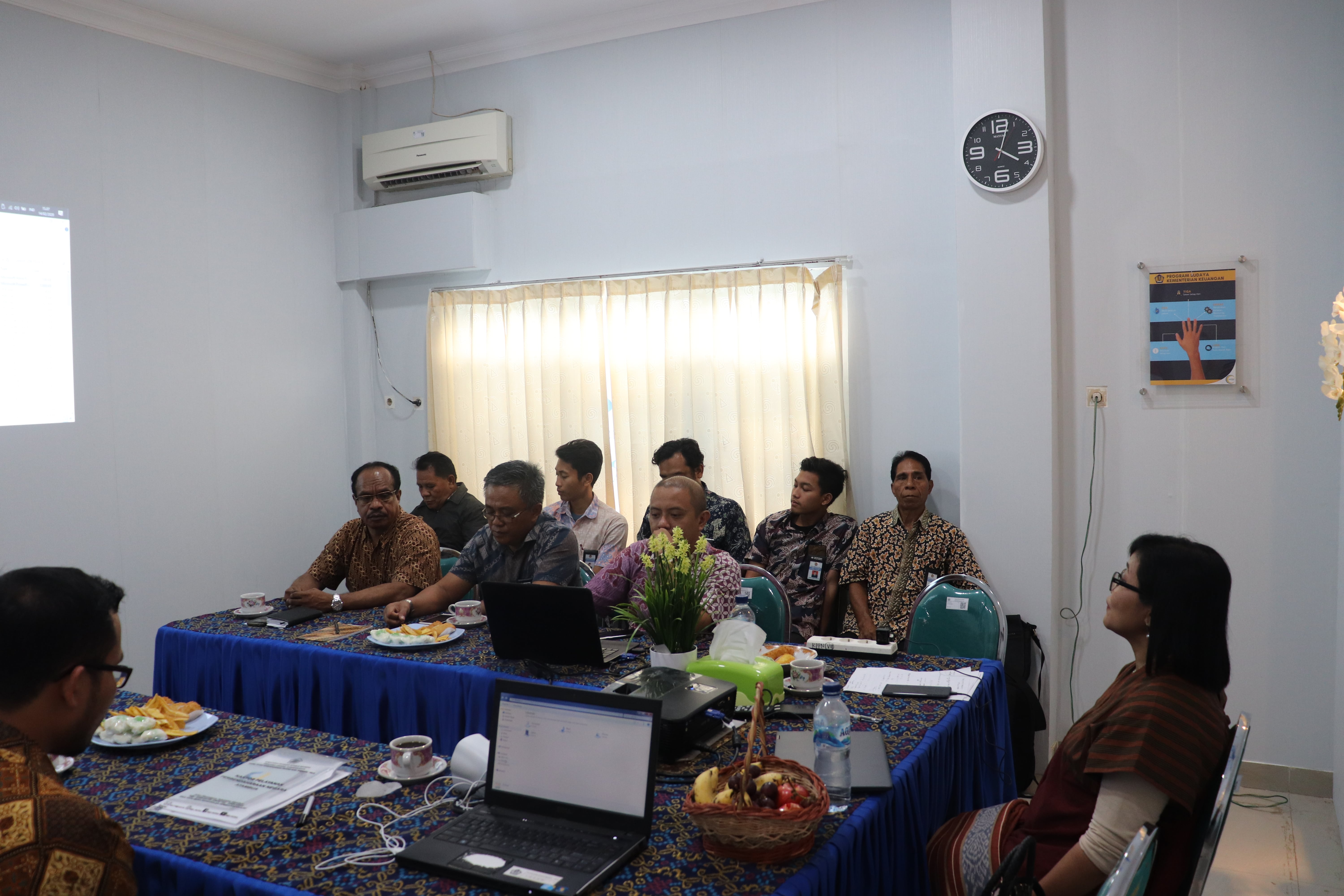 Kepala Kanwil DJPb Provinsi NTT Lydia Kurniawati dan staff bersama dengan Kepala Seksi Verifikasi, Akuntansi, dan Kepatuhan Internal, Udin Pramono, membedah satu per satu pengungkit beserta dokumen yang diperlukan. Ibu Lydia juga memberikan koreksi dan masukan untuk memperbaiki dari masing-masing indikator pengungkit yang belum mendapat nilai berdasarkan LKE hasil penilaian dari TIM Pusat Direktorat Jenderal Perbendaharaan.