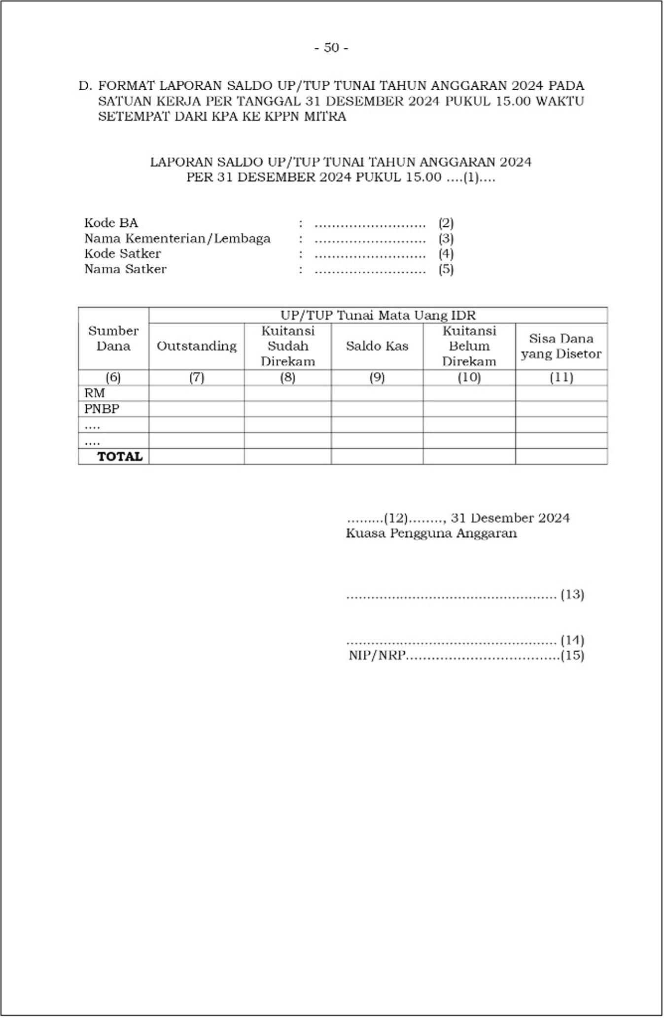 Format Laporan Saldo UP/TUP Tunai Tahun Anggaran 2024 dapat dilihat pada gambar di bawah: