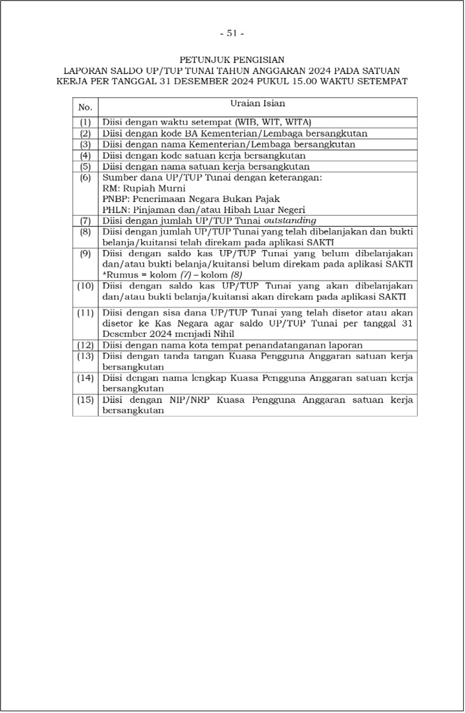 - Pengajuan SPM-GUP Nihil dan SPM-PTUP sebagaimana dimaksud pada ayat (1) yang disampaikan setelah tahun anggaran 2024 berakhir diberi tanggal 31 Desember 2024 dan pada uraian SPM ditambahkan frasa “Pengesahan atas pertanggungjawaban UP/TUP Tunai tahun anggaran 2024".