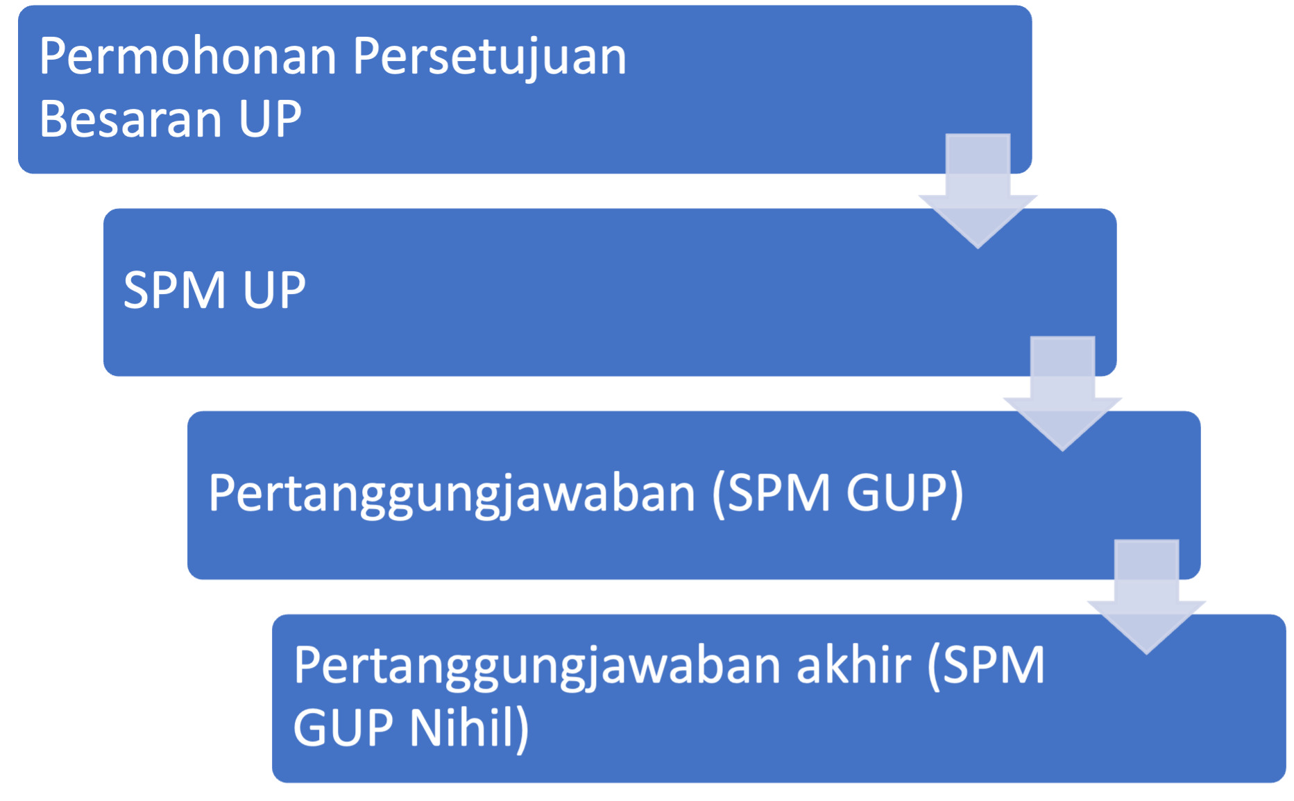 Dipertanggungjawabkan 1 bulan setelah terbitnya SP2D TUP menggunakan PTUP yang besarnya sama dengan nilai TUP. (Nilai sisa yang tidak digunakan dilakukan penyetoran dan dilampiri pada SPM PTUP dengan melampirkan surat pernyataan selisih pengguaan TUP). |