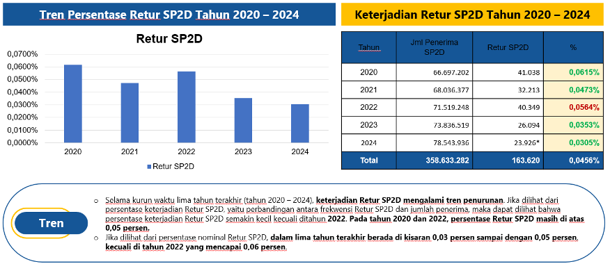 Perbandingan Jumlah Penerima SP2D dengan Retur SP2D (Tahun 2020-2024)