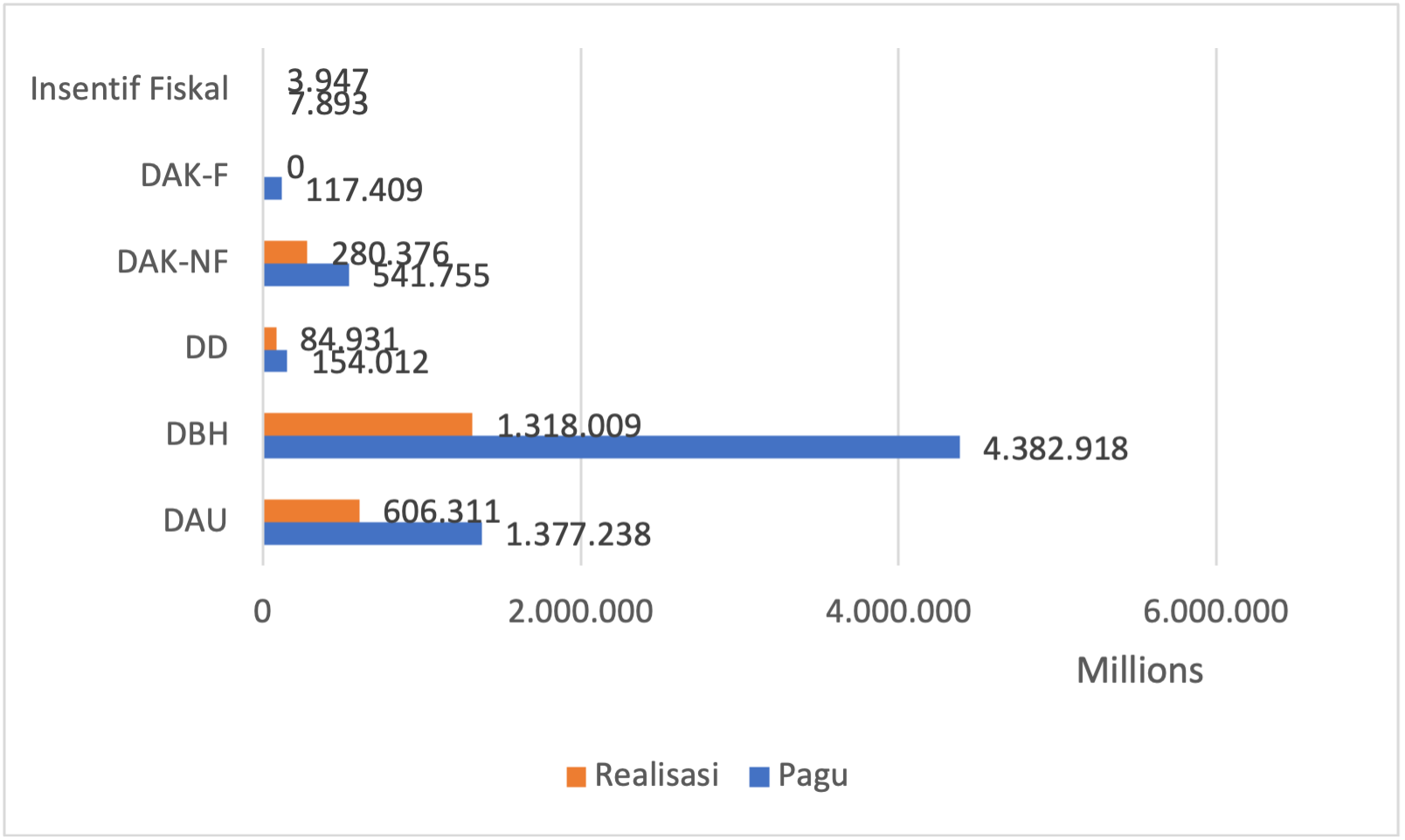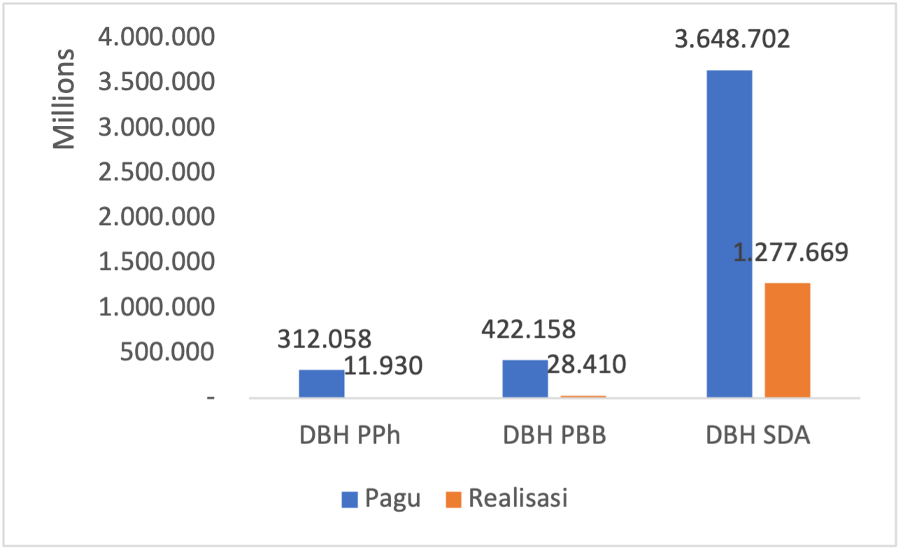 Sementara itu, realisasi penyaluran DBH telah mencapai 30,07% dari pagu DBH senilai Rp4.382.918.112.000,-. atau dengan kata lain senilai Rp1.318.009.071.500,-. Realisasi tersebut berasal dari penyaluran DBH PBB, DBH PPh serta DBH SDA. DBH PPh telah disalurkan senilai Rp11.930.280.000,- atau sebesar 0,91% PBB dari realisasi DBH sementara DBH telah disalurkan senilai Rp28.410.288.000,- atau 2,16 % dari realisasi DBH. DBH SDA menyumbang realisasi terbesar dari total nilai realisasi DBH sebesar 96,94% dengan nilai Rp1.277.668.503.500,-. Selain DBH, pada triwulan II, terdapat juga realisasi penyaluran Insentif Fiskal untuk Kota Balikpapan. Insentif Fiskal telah disalurkan senilai Rp3.946.619.500,- atau sebesar 50,00% dari pagu sebesar Rp7.893.239.000,-.