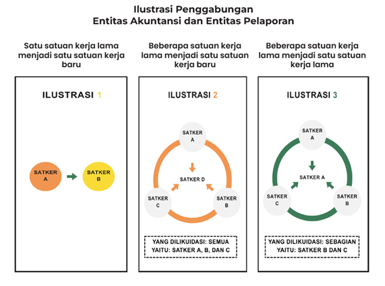 - Penggabungan Entitas Akuntansi atau Entitas Pelaporan terjadi ketika beberapa Entitas Akuntansi atau Entitas Pelaporan digabung menjadi satu Entitas Akuntansi atau Entitas Pelaporan baru dengan: