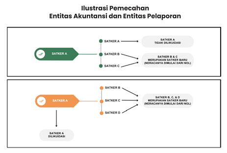 - Pemecahan Entitas Akuntansi atau Entitas Pelaporan terjadi ketika satu Entitas Akuntansi atau Entitas Pelaporan dipecah menjadi beberapa Entitas Akuntansi atau Entitas Pelaporan dengan: