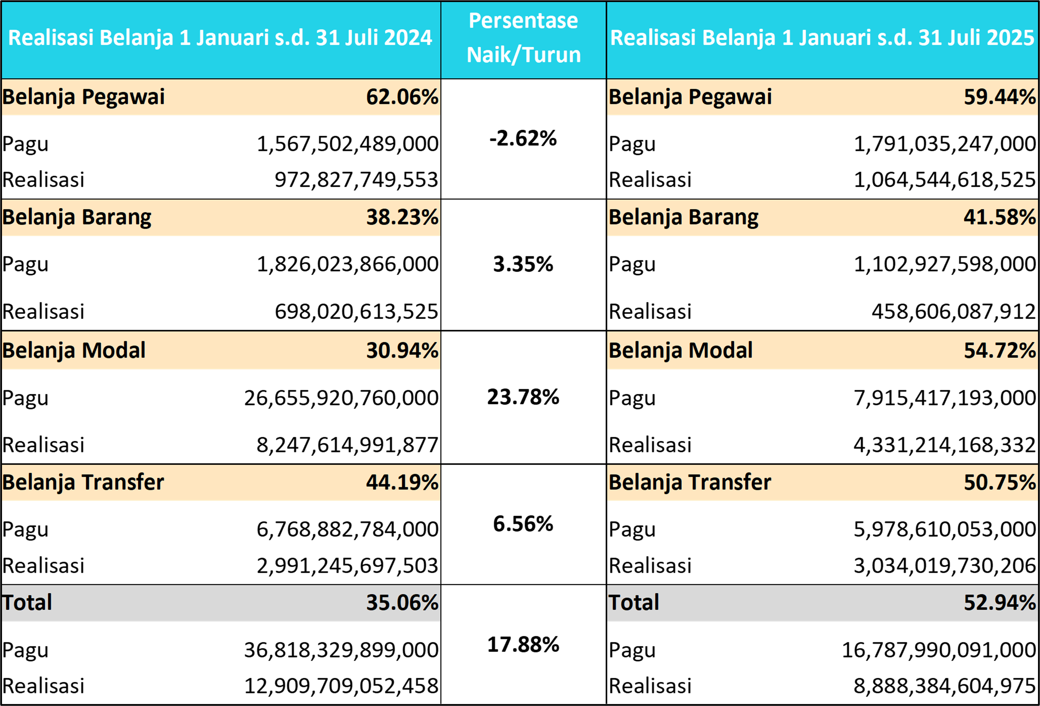 - Ketiga, realisasi belanja modal mencapai 54,72% atau Rp4.33 triliun dari pagu sebesar Rp 7.92 triliun