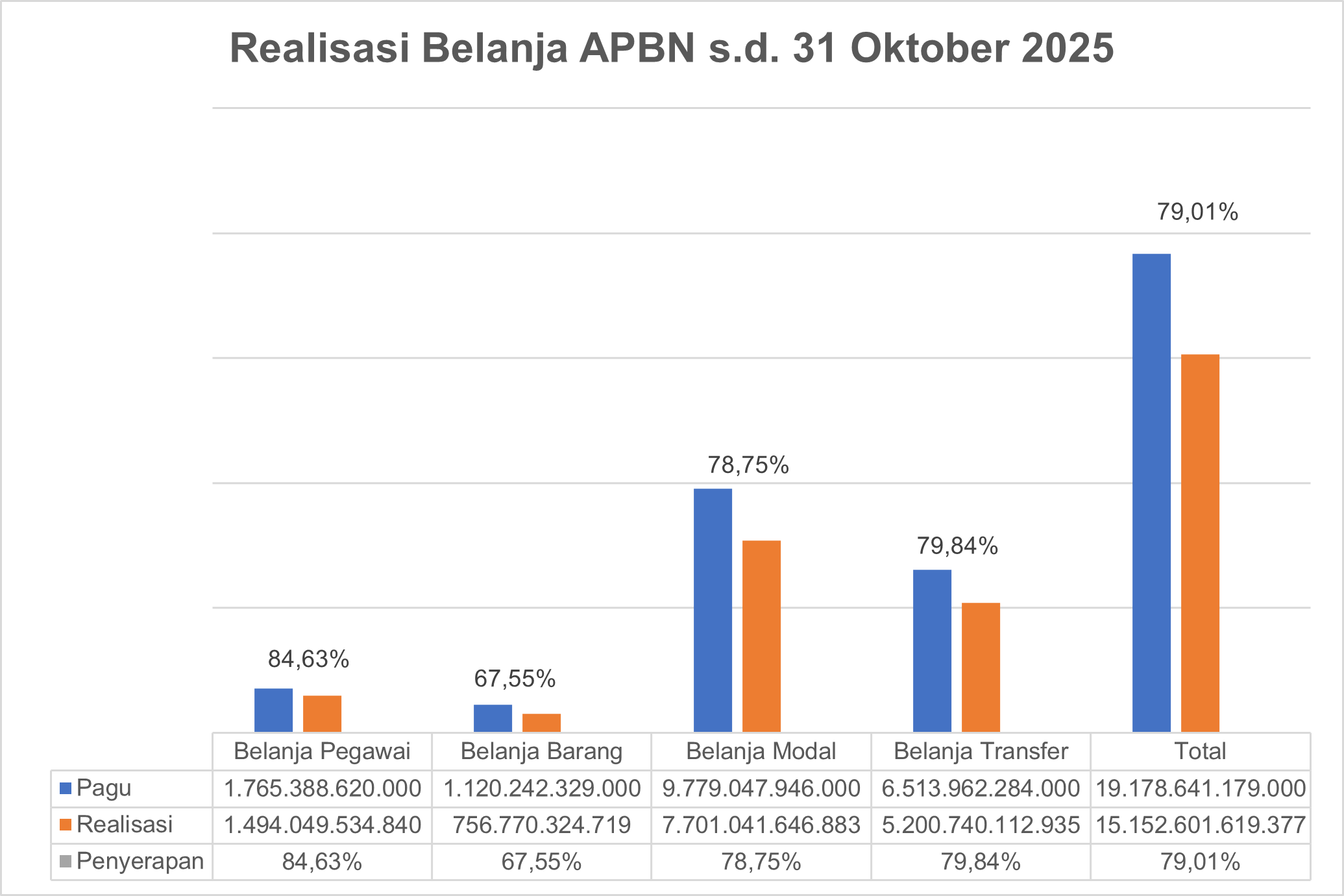 Hingga akhir Oktober 2025, pelaksanaan Anggaran Pendapatan dan Belanja Negara (APBN) di wilayah kerja Kantor Pelayanan Perbendaharaan Negara (KPPN) Balikpapan telah menunjukkan capaian yang signifikan. Dari total alokasi anggaran sebesar 19,1 triliun, telah terealisasi sebesar 15,1 triliun atau sebesar 79.01%. Jika ditinjau berdasarkan jenis belanja, alokasi terbesar terserap pada kategori Belanja Pegawai, yang telah mencapai 84,63% dari pagu yang tersedia. Sebaliknya, Belanja Barang mencatatkan realisasi terendah, yaitu sebesar 67,55%.