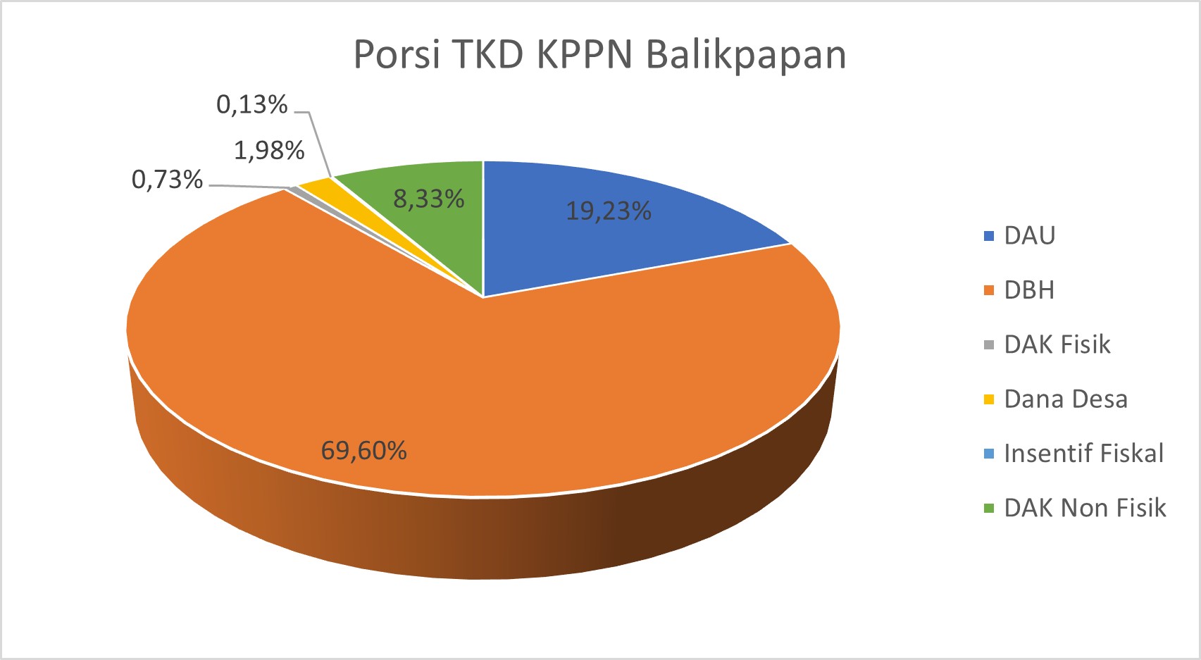 KPPN Balikpapan sebagai Kuasa Pengelola Anggaran Penyaluran Dana TKD senantiasa mengawal keberlanjutan penyaluran TKD. Penyaluran TKD pada triwulan IV mengikuti ketentuan yang diatur dalam Peraturan Direktur Jenderal perbendaharaan Nomor PER-17/PB/2025 tentang Langkah-Langkah dalam Menghadapi Akhir Tahun Anggaran 2025. Sampai dengan akhir bulan November 2025, KPPN Balikpapan telah menyalurkan dana TKD sebesar Rp6.024.613.619.124,- atau 92,49% dari pagu dana TKD KPPN Balikpapan secara keseluruhan. Dana TKD yang disalurkan KPPN Balikpapan selama tahun 2025 terdiri dari DAU, DBH, DAK Fisik, DAK Non Fisik, Dana Desa dan Insentif Fiskal. Penyaluran DBH memberikan kontribusi terbesar terhadap keseluruhan realisasi penyaluran dana TKD KPPN Balikpapan sebesar 69,59%. Sampai dengan akhir bulan November, Insentif Fiskal telah disalurkan 100% dari pagu. Rincian porsi alokasi jenis TKD adalah sebagai berikut: