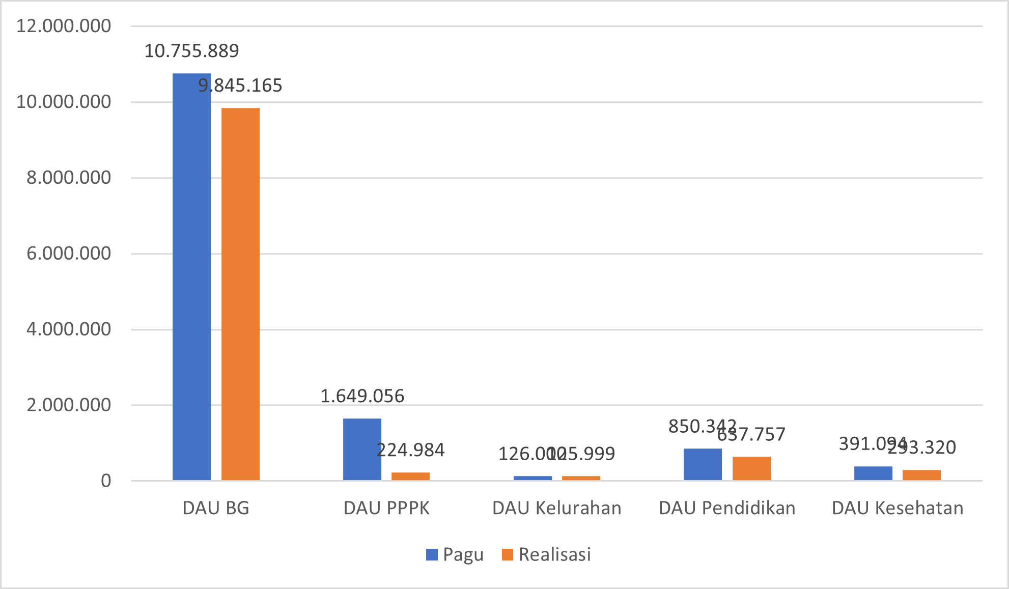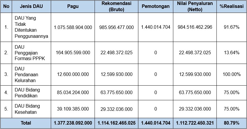 Pagu TKD DAU yang disalurkan KPPN Balikpapan adalah sebesar Rp1.377.238.092.000,-. DAU terdiri dari DAU BG, DAU SG Penggajian Formasi PPPK, DAU Pendanaan Kelurahan, DAU Bidang Pendidikan dan DAU Bidang Kesehatan. Sampai dengan tanggal 30 November 2025, KPPN telah menyalurkan DAU sebesar 80,79% dari pagu. Terdapat potongan DAU BG yang salah satunya dikarenakan adanya sisa DAK Non Fisik di RKUD sampai dengan tahun anggaran 2024.